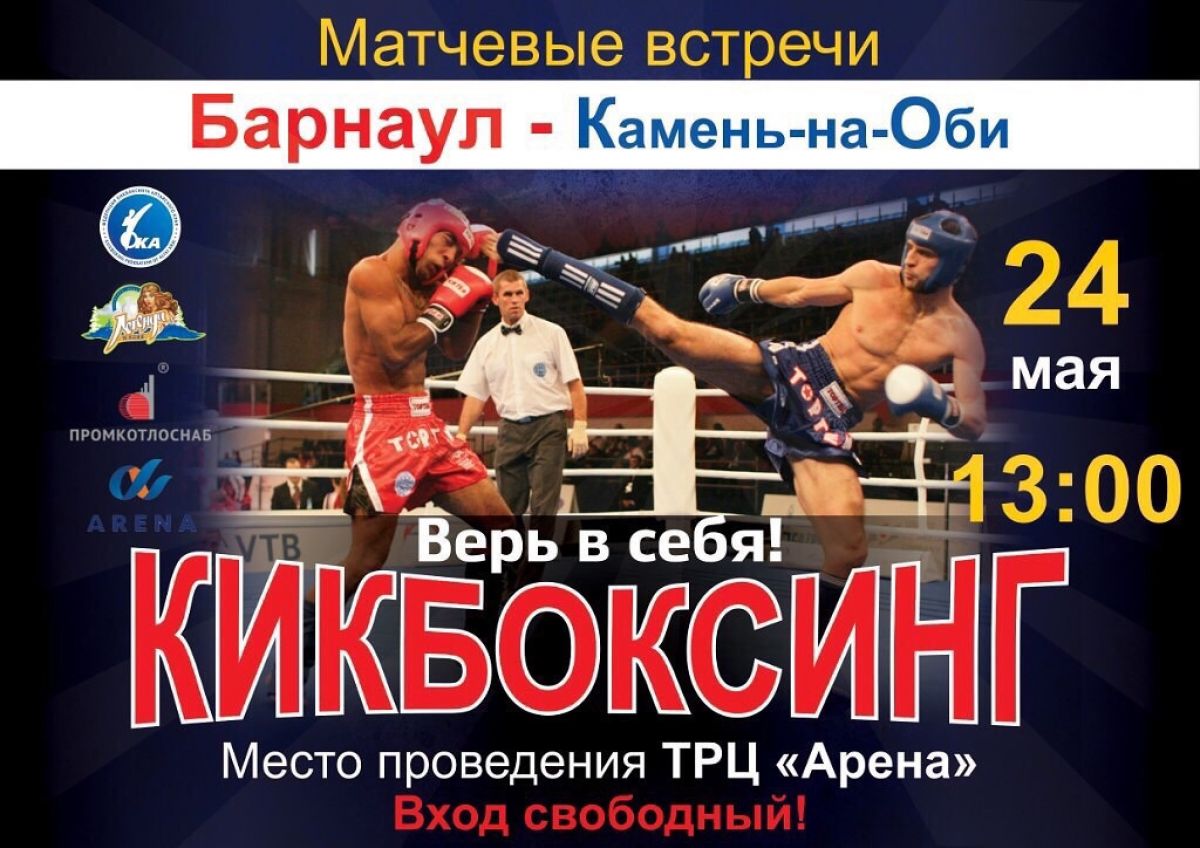 24 мая в краевом центре состоится матчевая встреча Барнаул -Камень-на-Оби. 21 мая 2015 14:13 24 мая в краевом центре состоится матчевая встреча Барнаул -Камень-на-Оби. Соревнования пройдут в торгово-развлекательном центре «Арена» по адресу Павловский тракт, 188. Начало в 13.00. 24 мая в краевом центре состоится матчевая встреча Барнаул -Камень-на-Оби. Вид спорта: Кикбоксинг