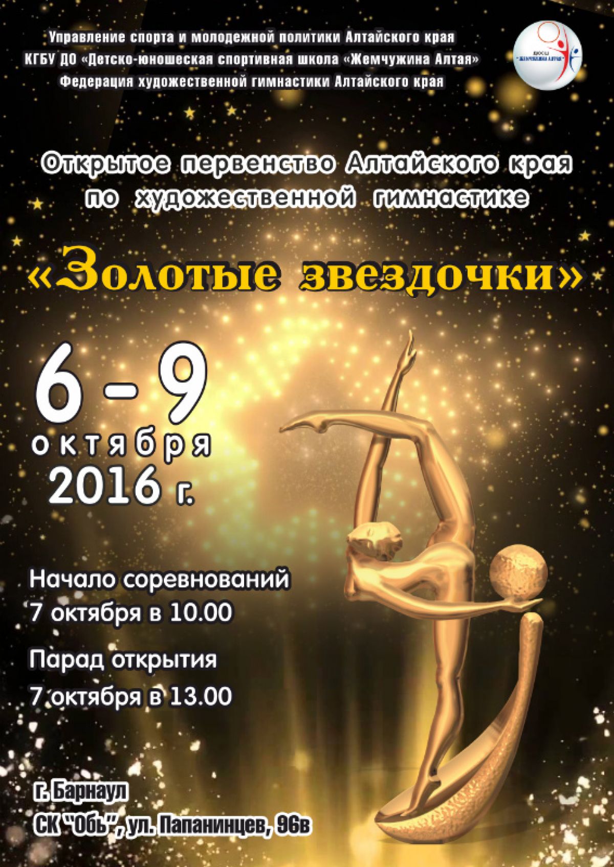 В Барнауле сегодня стартует первенство Алтайского края «Золотые звёздочки». 7 окт. 2016 11:01 В Барнауле сегодня стартует первенство Алтайского края «Золотые звёздочки». Соревнования пройдут 7−9 октября в спортивном комплексе «Обь» (ул. Папанинцев, 96в). Открытие турнира состоится 7 октября в 13:00. Вид спорта: Художественная гимнастика