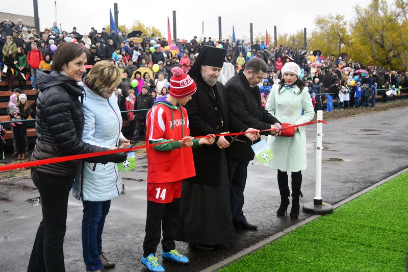 Далее по традиции была перерезана красная ленточка. Этого права удостоились Елена Лебедева, Татьяна Ильюченко, Виталий Самобочий, преосвященный епископ Славгородский и Каменский Всеволод, а также один из местных воспитанников ДЮСШ.