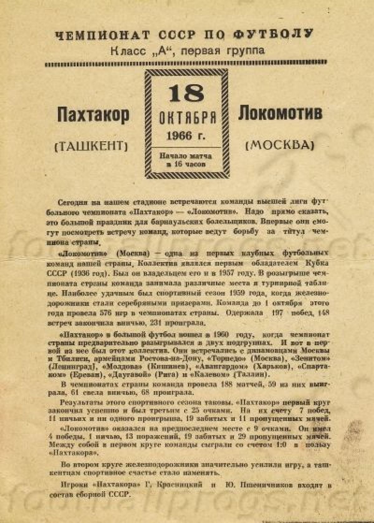 Здесь было бы нелишним рассказать, что представляли собой «Локомотив» и «Пахтакор» образца октября 1966 года. Если вы слабо знакомы с историей советского футбола, то сразу хочется сообщить, что тот «Локомотив» был командой совершенно другого статуса, чем нынешний. Это начиная с 90-х годов команда постоянно боролась если не за первые места, то уж, по крайней мере, за еврокубки. В советское время в основном всё было иначе. Никакими еврокубками болельщики не грезили, а выражение «пятое колесо» вы все наверняка слышали.