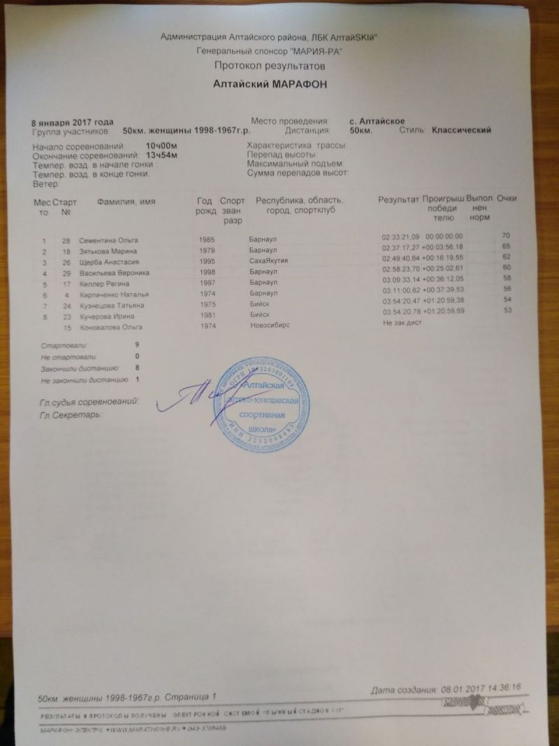 Если у мужчин борьба за первенство получилась жёсткой, то у женщин марафон уверенно выиграла Ольга Сементина (Кузюкова). Половину дистанции она прошла в компании с Мариной Зятьковой, но затем оторвалась. Кстати, для Марины, известной успехами в соревнованиях коньковым ходом, это был первый 50-километровый забег классическим стилем. Третьей на марафонской дистанции финишировала Анастасия Щерба из Якутии. Лыжники из этой северной республики находятся в Горном Алтае на сборах на Семинском перевале и с удовольствием приняли участие в соревнованиях.