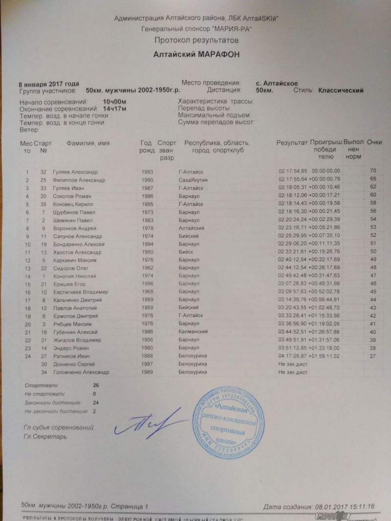Это был первый марафон в Алтайском крае в новом лыжном сезоне. В общей сложности на старт вышло около 400 лыжников, из них 35 спортсменов - 26 мужчин и 9 женщин, которые боролись за призовой фонд размером 110 тысяч рублей. Остальные приехали 8 января чисто за удовольствием. Наградой за пройденные километры было бодрое настроение, приятная боль в мышцах и созерцание прекрасной природы на всём протяжении дистанции. И, конечно, всем участникам, преодолевшим 50 или 25 км, приятно было получить 1000-рублевые сертификаты от главного спонсора марафона - компании «Мария-Ра».
