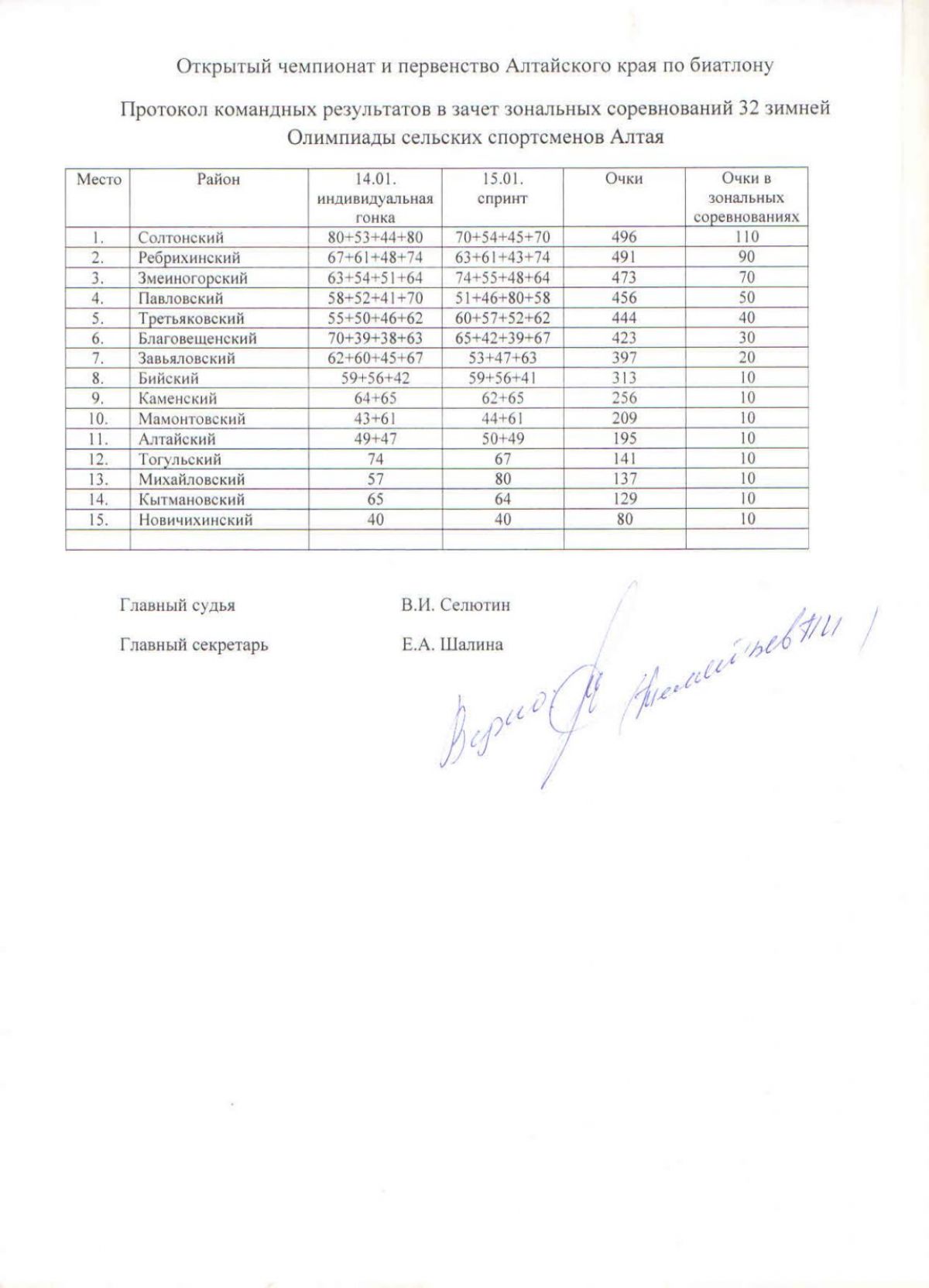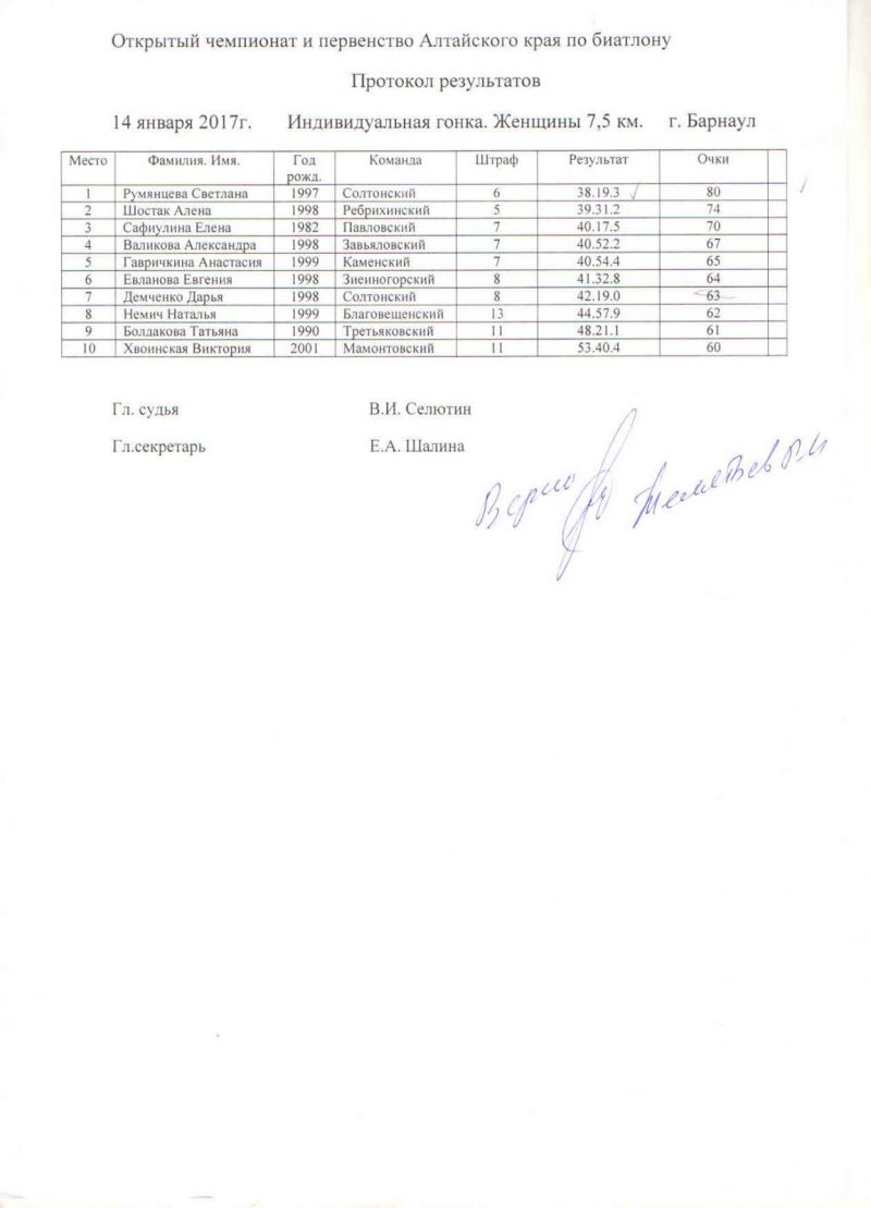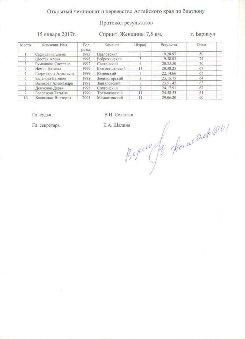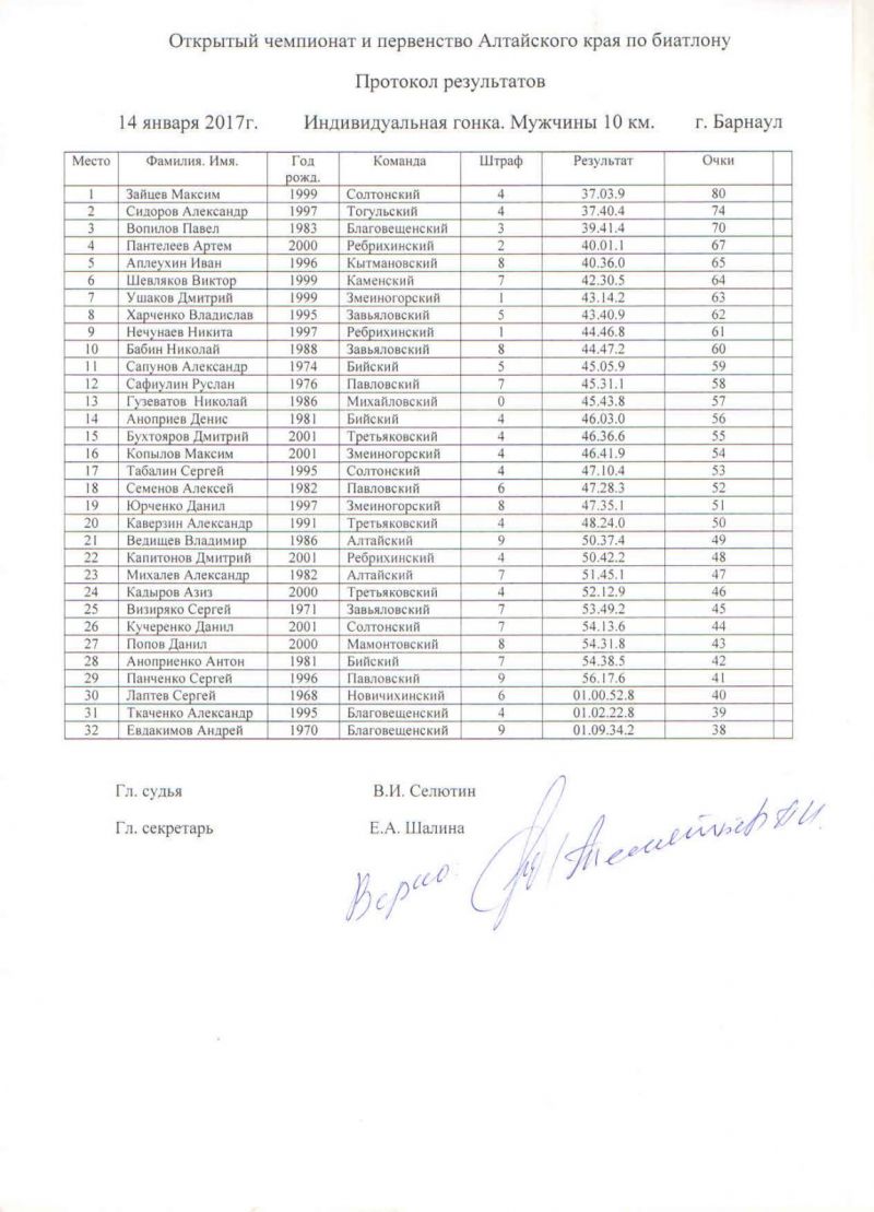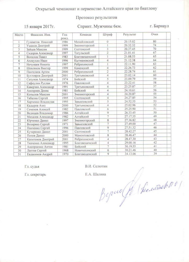 В прикрепленных ниже файлах протоколы соревнований по биатлону и общая таблица XXXII зимней олимпиады сельских спортсменов Алтайского края.
