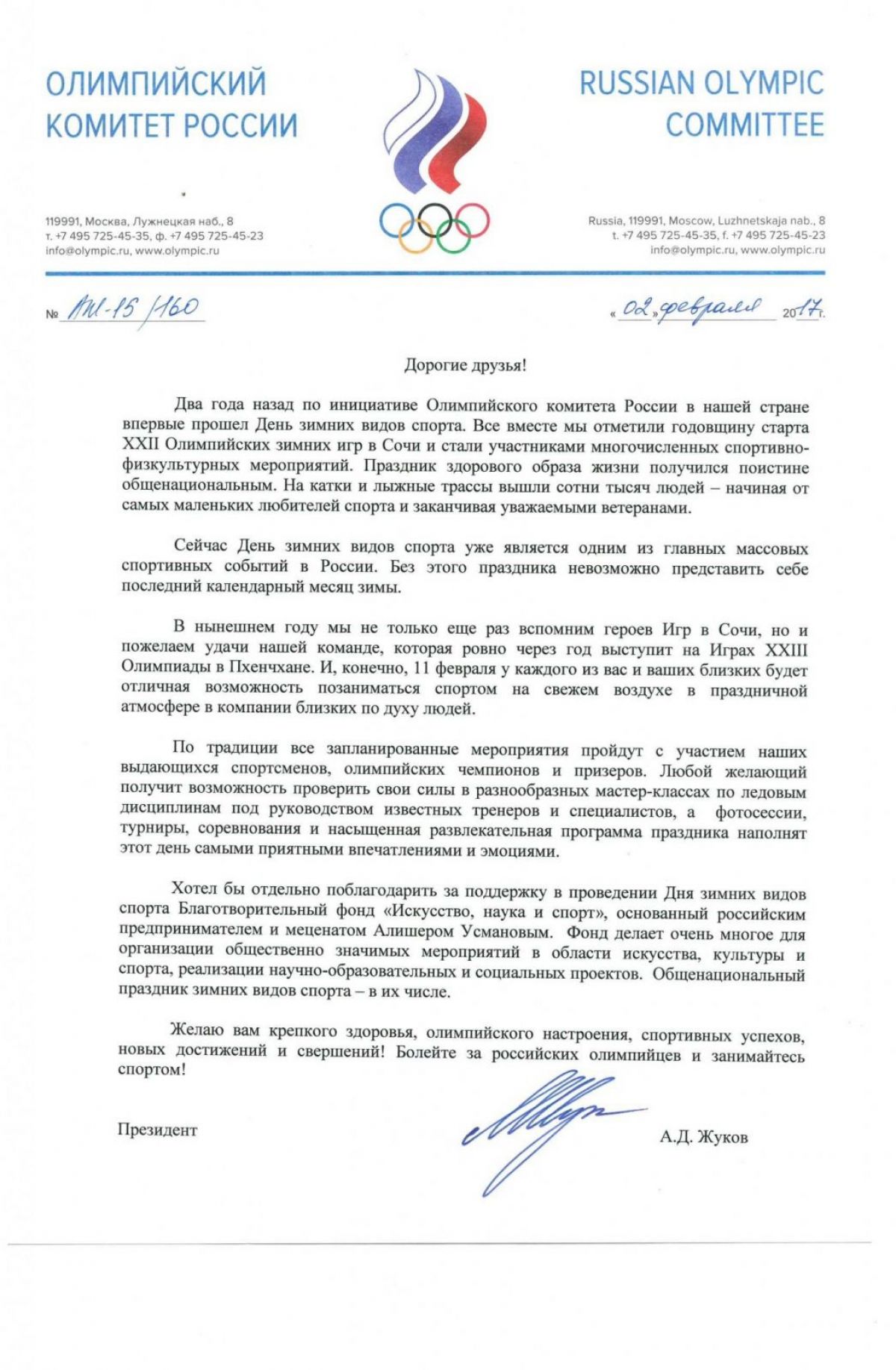 Александр Жуков пожелал всем крепкого здоровья, олимпийского настроения, спортивных успехов, новых достижений и свершений.