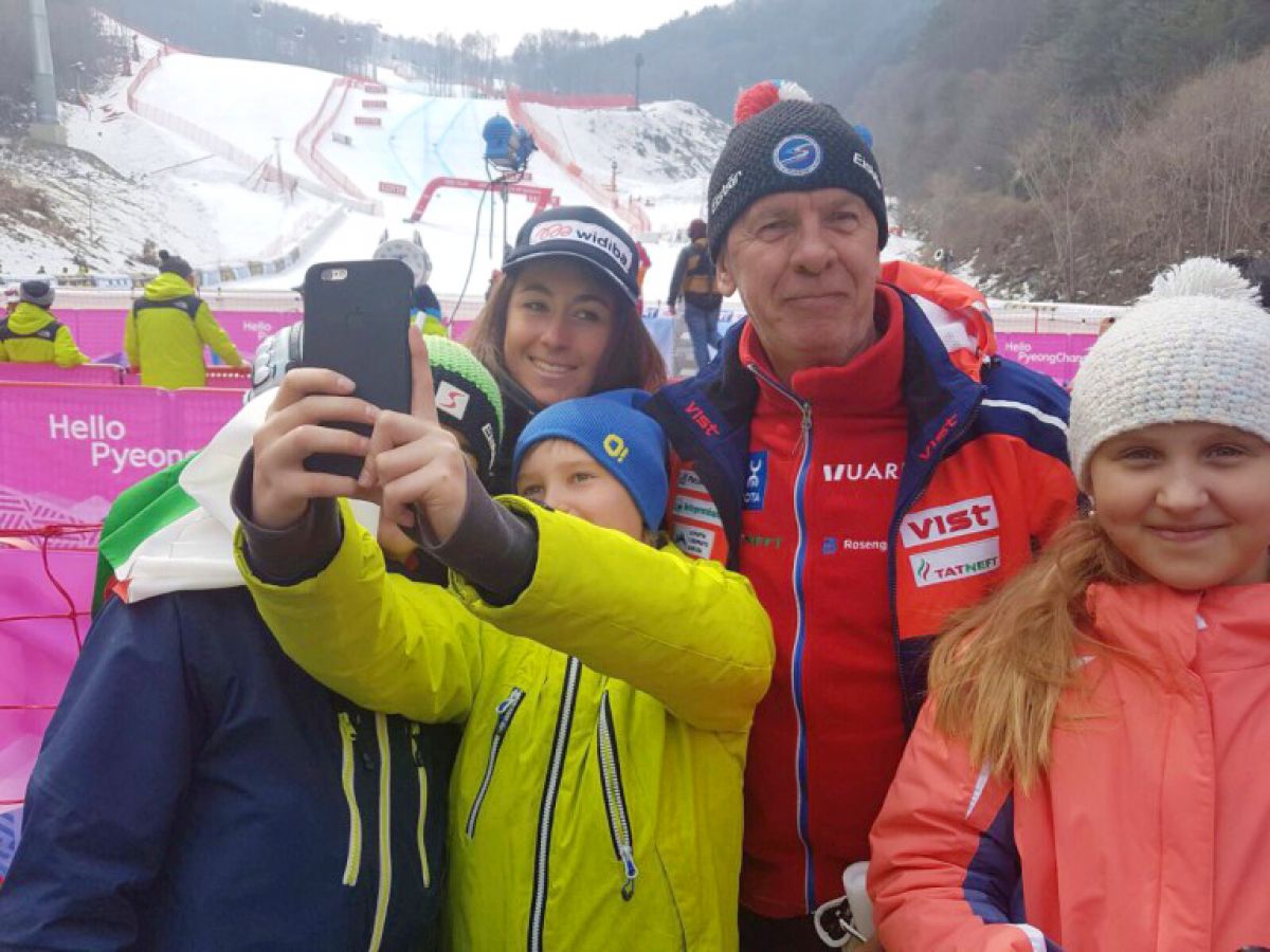 На фото: юные горнолыжники из Алтайского края на олимпийских объектах Пхёнчхана, на одном из снимков они фотографируются с итальянкой Софией Годжиа, которая выиграла скоростной спуск на корейском этапе Кубка мира.