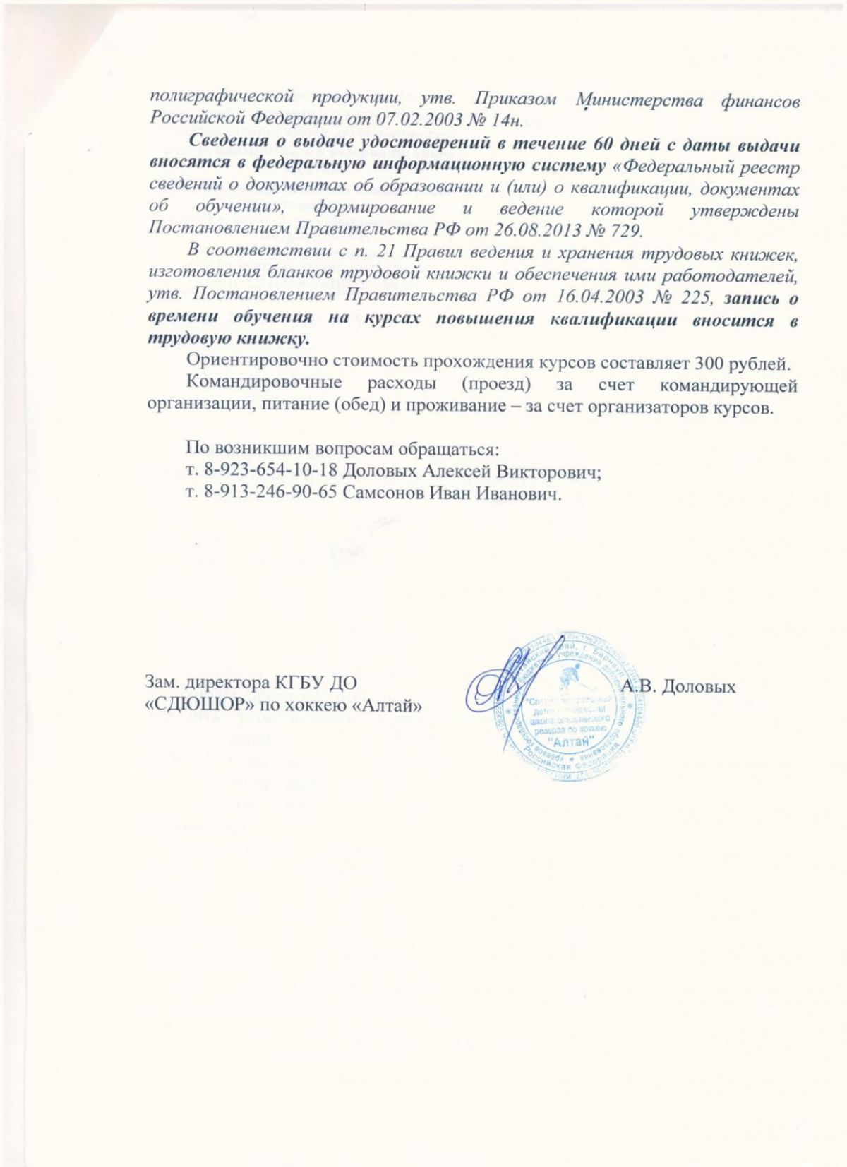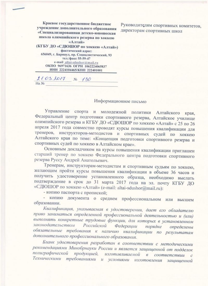 В апреле в Барнауле состоятся курсы для хоккейных тренеров и судей по теме «Концепция подготовки спортивного резерва и спортивных судей по хоккею в Алтайском крае».