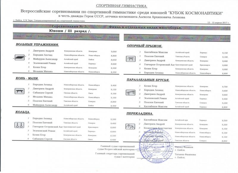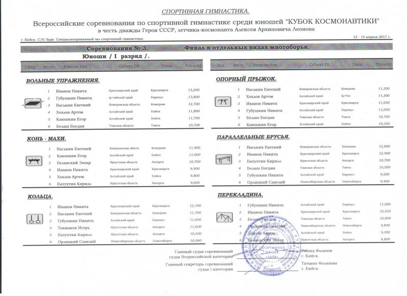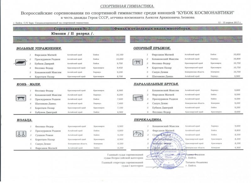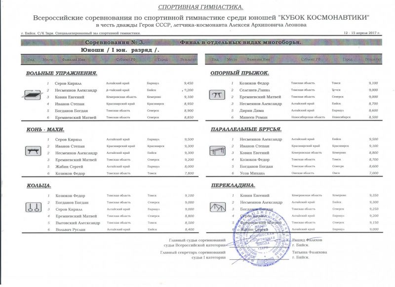 В отдельных видах многоборья по программе первого юношеского разряда барнаулец Кирилл Серов завоевал золотые медали в вольных упражнения и упражнениях на коне, а Александр Несмеянов - на параллельных брусьях. По программе второго разряда Матвей Фирсанов первенствовал в вольных упражнениях и опорном прыжке, Максим Кохановский из Барнаула был лучшим на параллельных брусьях и перекладине. Ещё один барнаулец Максим Касенбеков по программе третьего спортивного разряда выиграл две золотые награды - в опорном прыжке и на перекладине. Среди спортсменов первого разряда Никита Губушкин из Барнаула занял первое место в упражнениях на перекладине.