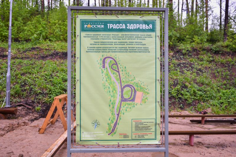 «Трассу здоровья» открыли в алтайском городе-курорте 16 мая. Она берёт свое начало от эко-отеля «Эхо» и пролегает по сосновому бору. Как сообщает пресс-служба ЗАО «Санаторий «Россия», протяженность трассы составила 1170 метров (включая длину эллипсов на стрельбище и штрафного круга). Рельеф естественный: ровные участки сменяются спусками и подъёмами, перепады высот достигают 20 метров. Трасса заасфальтирована, имеет разметку, полностью освещена.«Трасса здоровья» может использоваться как терренкур для оздоровительной ходьбы, а также удобна для прогулок на велосипедах, катания на роликах и скейтбордах, отлично подойдёт для пеших прогулок всей семьёй. В зимнее время, после подготовки поверхности профессиональным ратраком, объект будет использоваться в качестве беговой лыжной трассы.