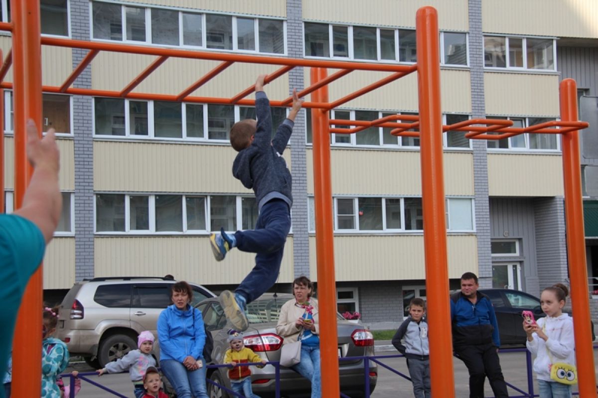Посмотреть, как они крутят на турнике солнышко и выполняют различные силовые элементы, сбежалась местная детвора и сопровождающие её родители и бабушки. Малыши тут же повисли на тренажёрах.