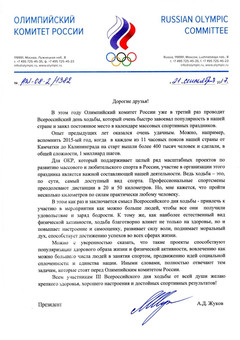 Обращение президента Олимпийского комитета России Александра Жукова к участникам Всероссийского дня ходьба - в прикреплённом ниже файле.