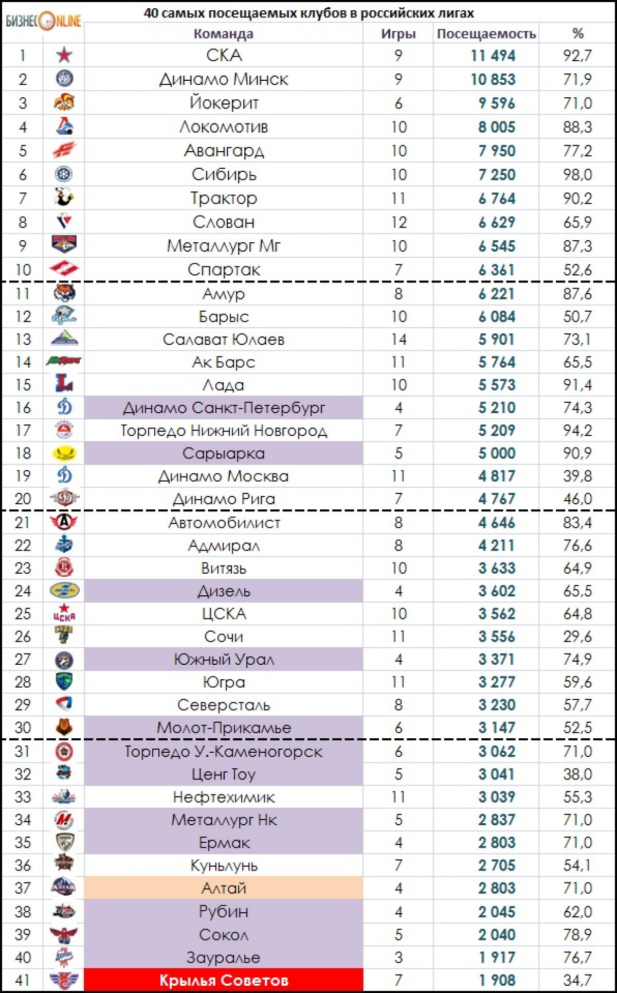 Ниже представлена общая таблица рейтинга посещаемости хоккейных клубов в российских лигах.