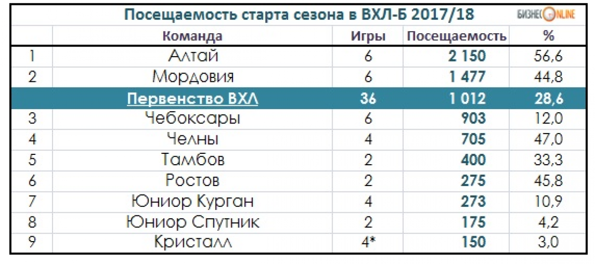 Самая высокая посещаемость у барнаульского «Алтая» (2150), следом за ним идёт саранская «Мордовия» (1477), которая после завершения строительства арены на 7,5 тысячи зрителей точно покинет ВХЛ-Б. Тройку лучших команд в табеле о посещаемости замыкают «Чебоксары». В столице Чувашии на хоккей в среднем ходят около 900 зрителей, хотя домашняя арена клуба рассчитана на внушительные 7,5 тысячи мест. Этот дворец, безусловно, слишком хорош для уровня этого дивизиона, но у клуба недостаточно средств, чтобы заявиться в ВХЛ.