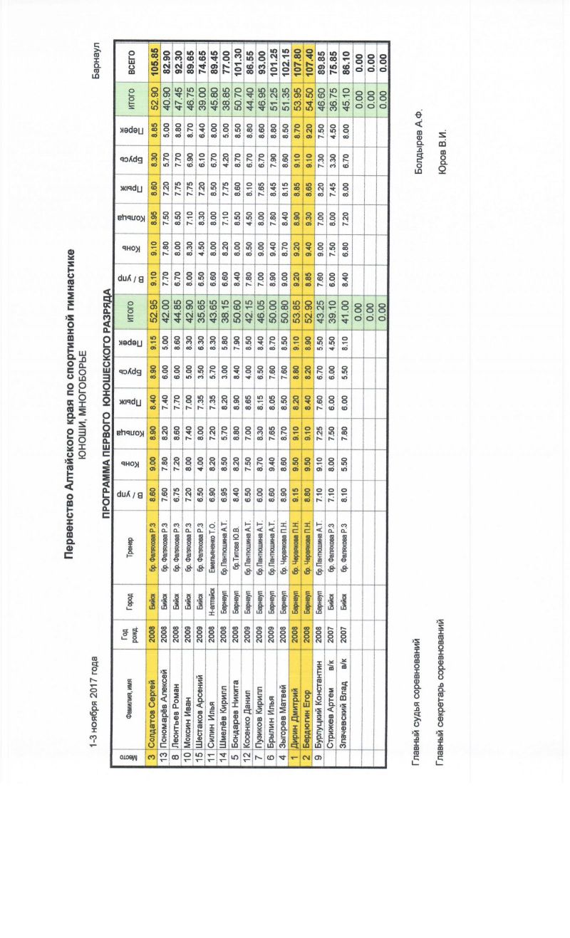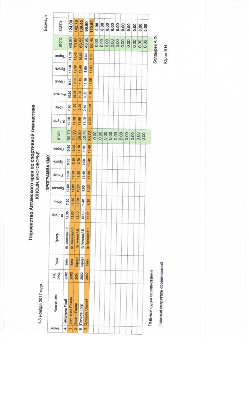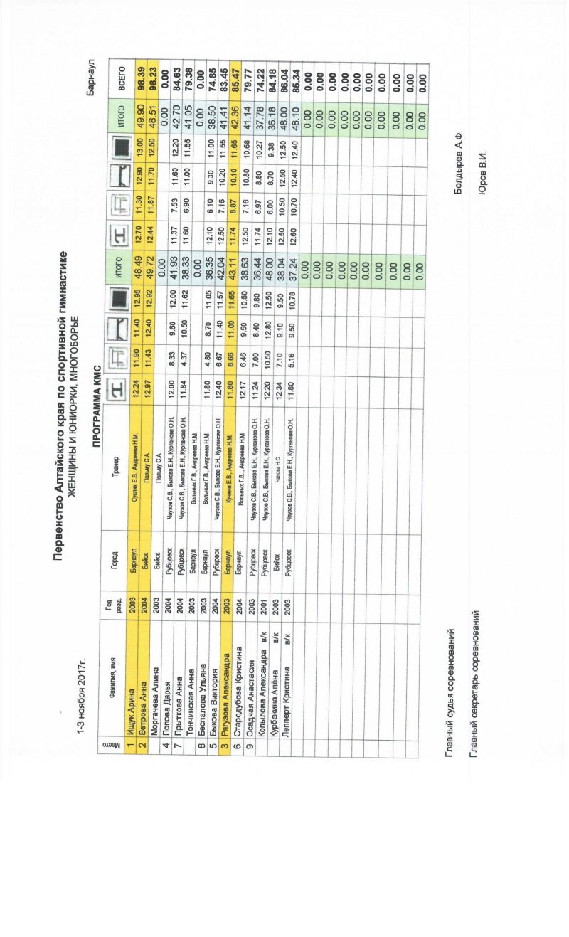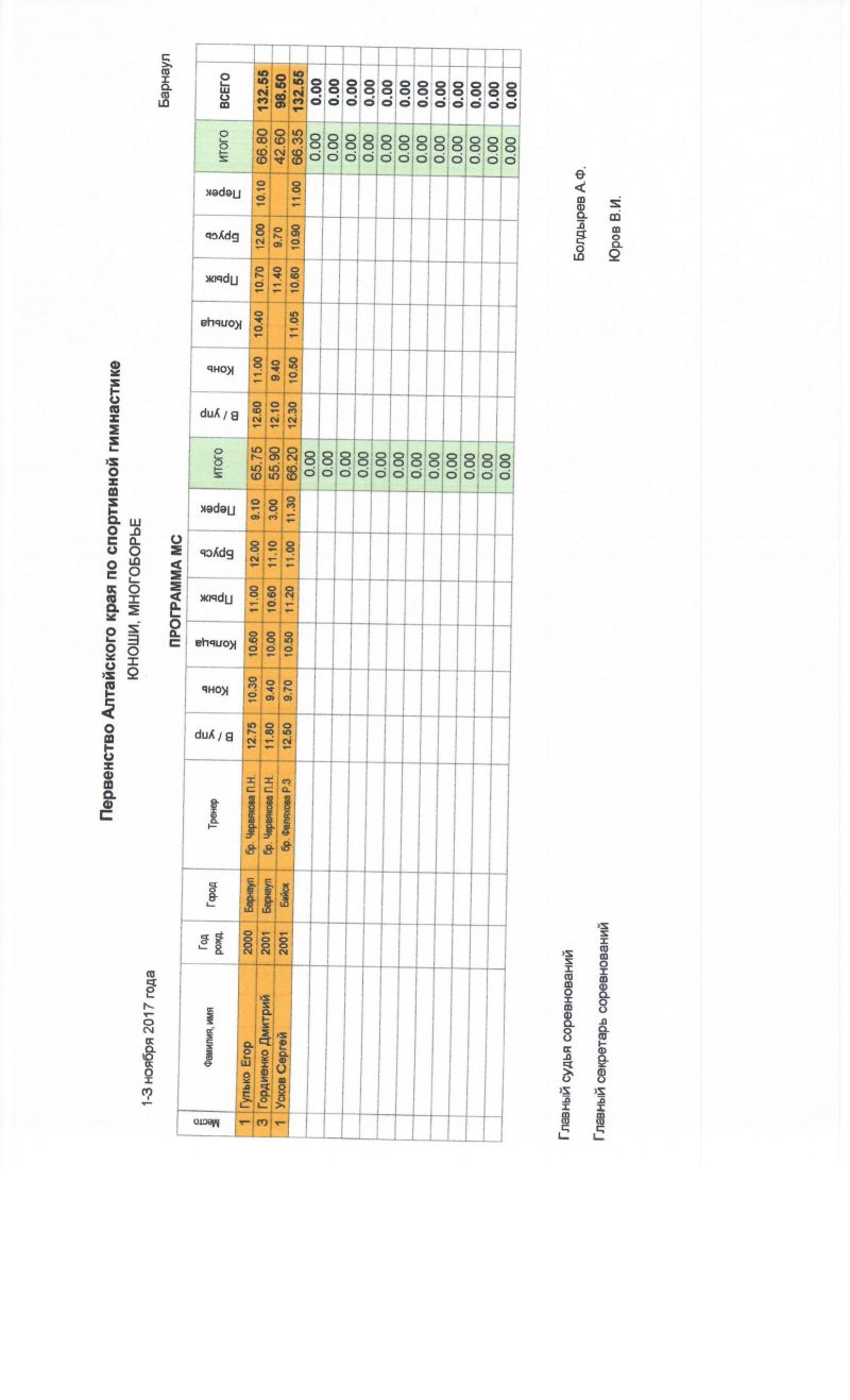 Сильнейшие гимнасты региона выступали по программе мастеров спорта. В мужских соревнованиях первое место поделили барнаулец Егор Гулько и бийчанин Сергей Усков, а в женских - Ирина Митренёва из Барнаула. По программе кандидатов в мастера спорта победителями стали Роман Зинченко из Бийска и Арина Ищук из Барнаула.