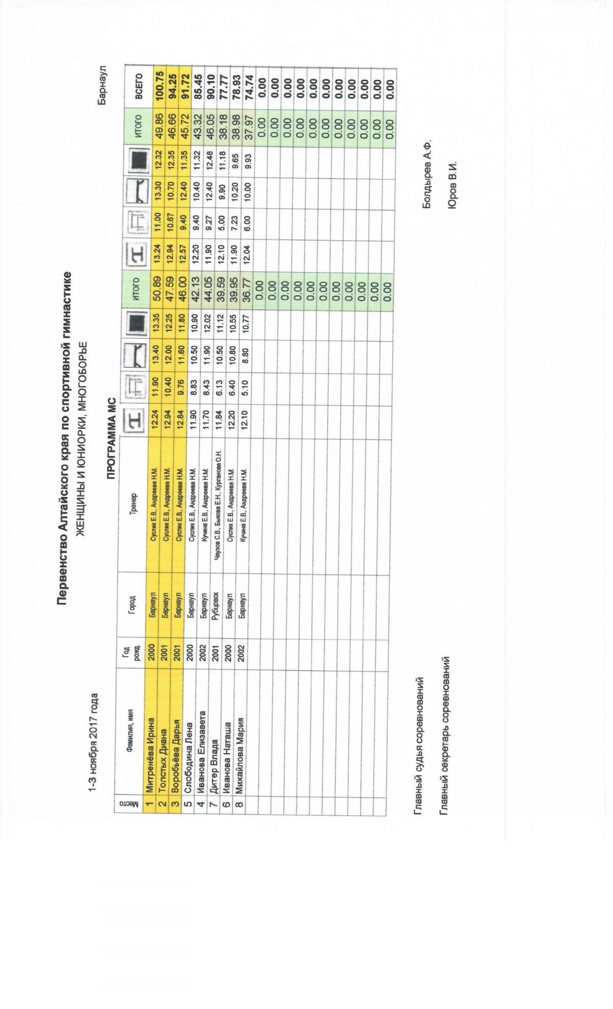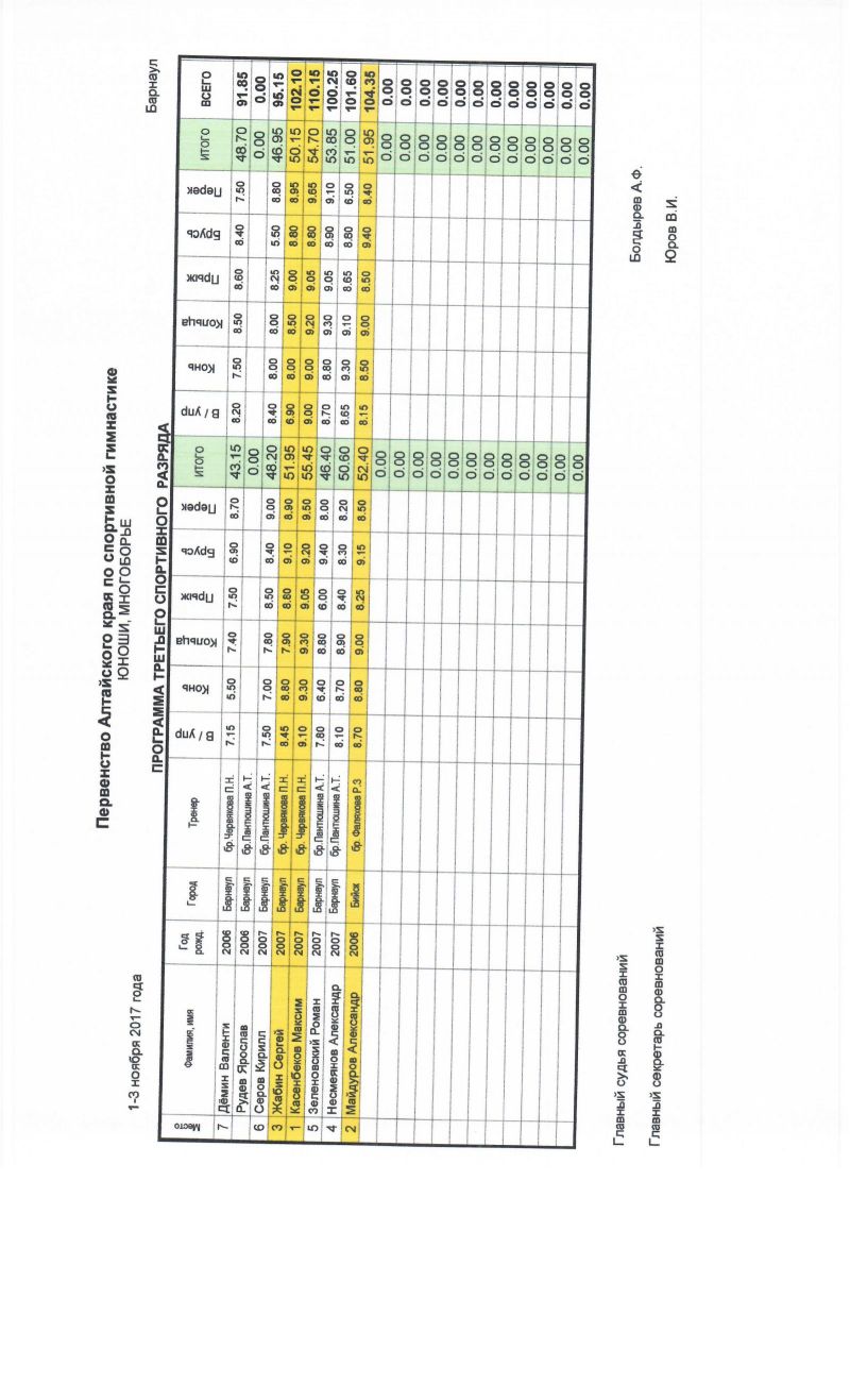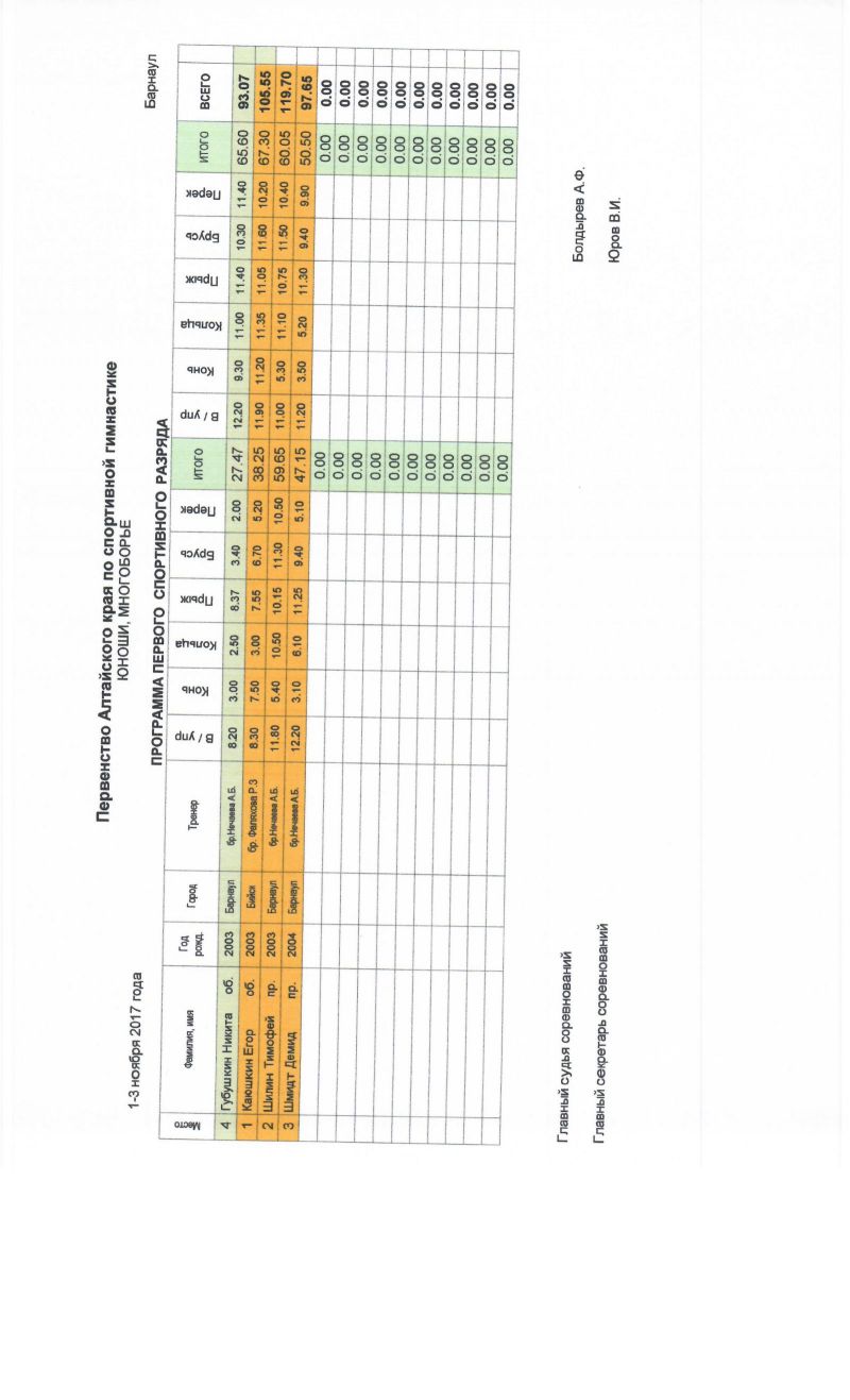 Сильнейшие гимнасты региона выступали по программе мастеров спорта. В мужских соревнованиях первое место поделили барнаулец Егор Гулько и бийчанин Сергей Усков, а в женских - Ирина Митренёва из Барнаула. По программе кандидатов в мастера спорта победителями стали Роман Зинченко из Бийска и Арина Ищук из Барнаула.