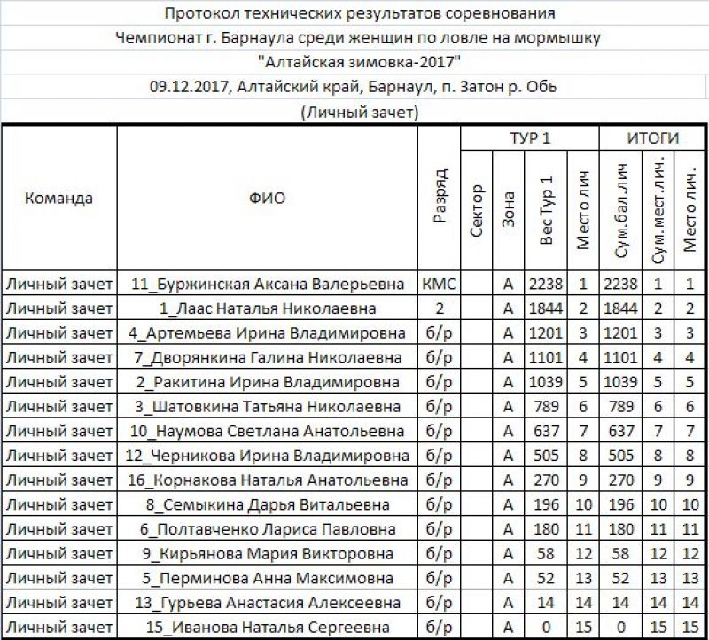 Результат превзошёл ожидания. Участницы остались довольны соревнованиями, а организаторы - участницами. Победу одержала опытная спортсменка из Рубцовска, кандидат в мастера спорта Аксана Буржинская, поймавшая за три часа 2238 граммов рыбы. Второе место с уловом 1844 грамма заняла один из организаторов и идейный вдохновитель курсов «Основы зимней женской рыбалки» Наталья Лаас, третье - Ирина Артемьева, поймавшая 1201 грамм. Ирину можно назвать ученицей Натальи, так как она училась на курсах «Основы зимней женской рыбалки». Также с уловами за килограмм закончили соревнования курсистки Галина Дворянкина (1101 грамм) и Ирина Ракитина (1039).