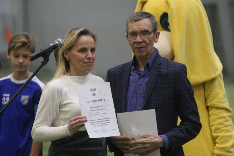 Виктор Горлов вручил благодарности Российского футбольного союза директору СДЮШОР Алексея Смертина Евгению Татаринцеву, тренерам Оксане Жбанниковой и Владимиру Евглевскому за развитие женского футбола.