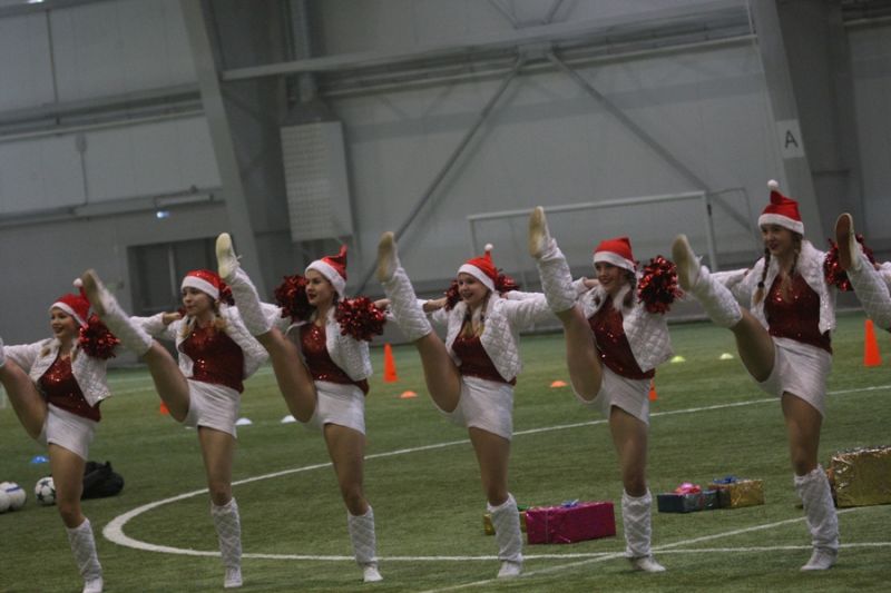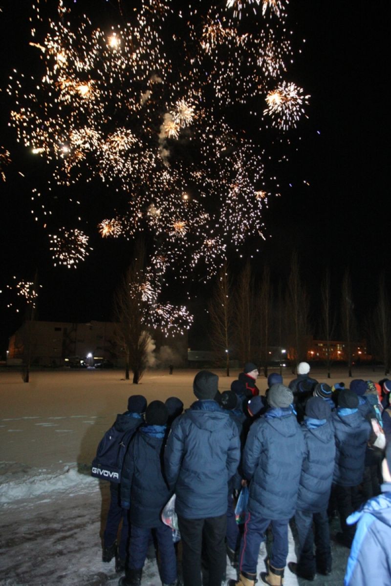 Вечер под крышей манежа продолжился интереснейшими футбольными конкурсами, а завершился он уже на улице праздничным салютом в морозном небе.