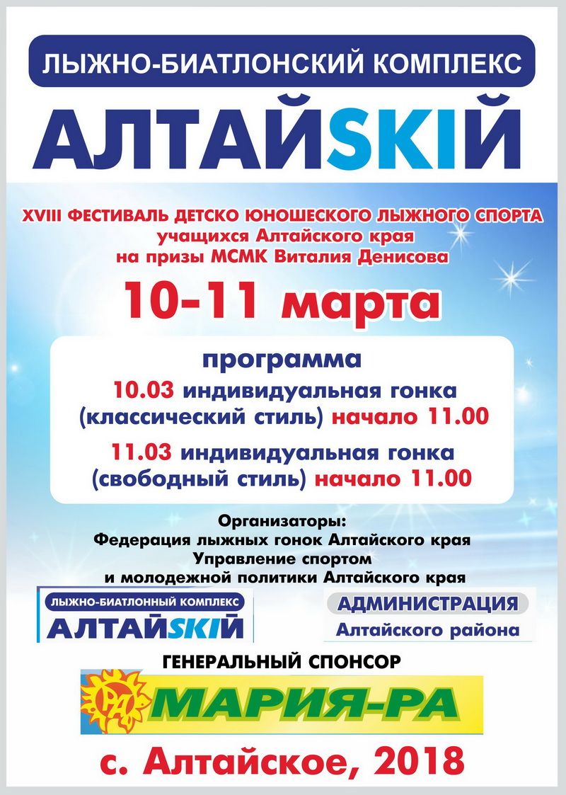 10−11 марта. Село Алтайское. ЛБК «АлтайSKIй». XVIII фестиваль детско-юношеского лыжного спорта на призы Виталия Денисова