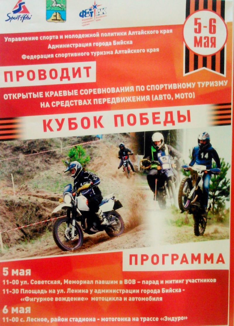 5−6 мая. Бийск. Открытые краевые соревнования «Кубок Победы» по спортивному туризму на средствах передвижения (авто, мото)