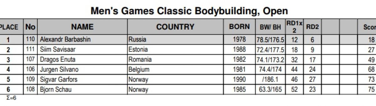Соревнования состоялись 3 мая в Санта-Сусанне (Испания). Самый титулованный бодибилдер Алтайского края Александр Барбашин - победитель турнира «Арнольд Классик Европа», многократный призёр чемпионатов мира - на этот раз выступал в новой категории Games Classic bodybuilding. Его соперниками были спортсмены из Норвегии, Бельгии, Румынии и Эстонии. Всего в категорию заявилось шесть участников.