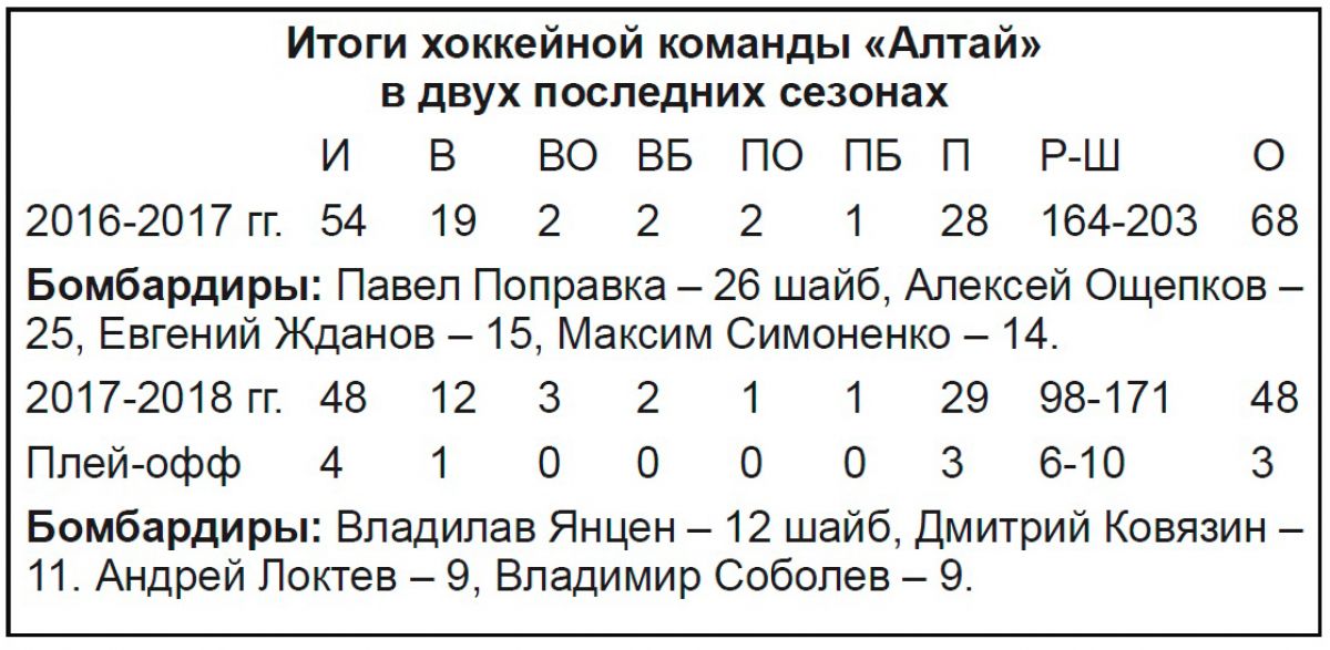 В итоге предпоследнее, 8-е, место в первенстве ВХЛ (годом ранее - девятое, тоже предпоследнее). Однако нынешнее достижение - выход в плей-офф с восьмого места - как-то неловко даже и назвать шагом вперёд. «Алтай» два года подряд показывает слабые результаты, а теперь ещё и низкую результативность. Очевидно, что нынешняя команда, которая уже распущена до июля, не сильнее прошлогодней.
