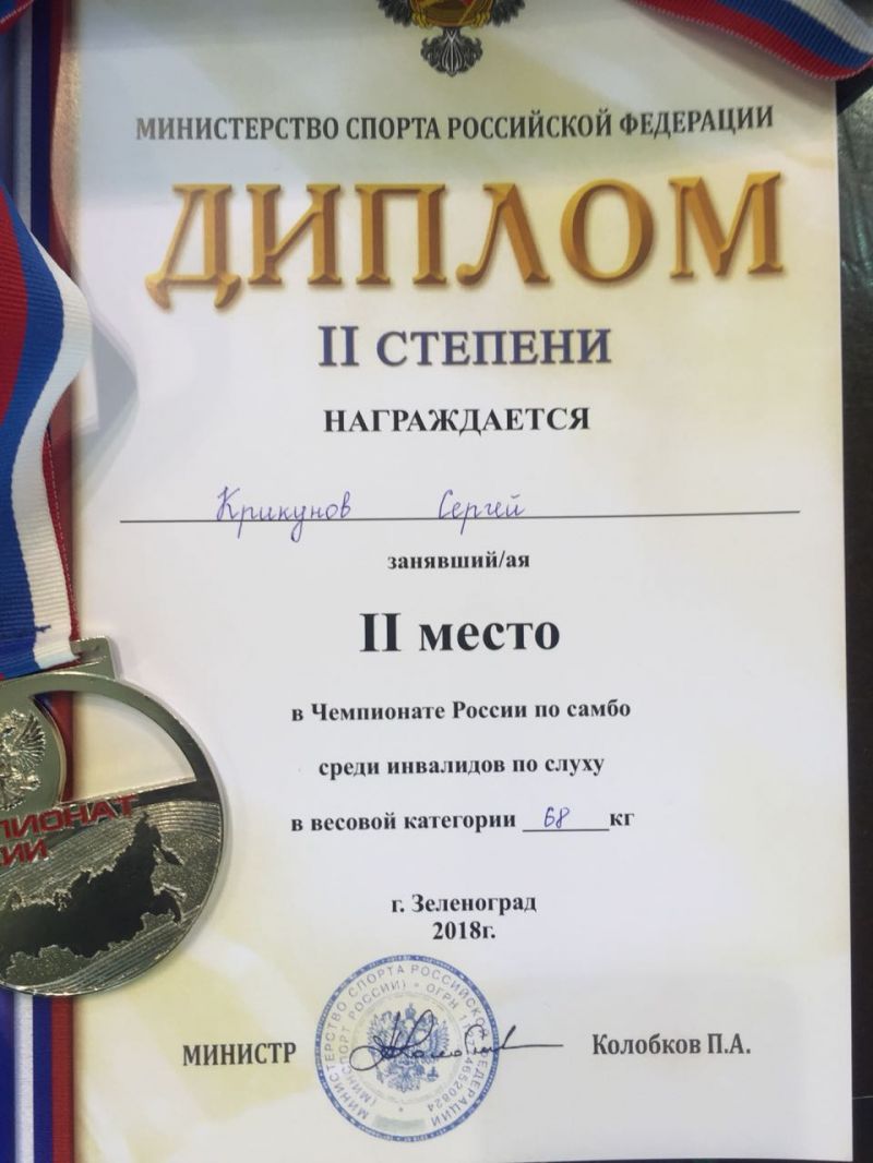 Выпускник бийской спортшколы олимпийского резерва № 3 занял второе место на чемпионате России по самбо среди инвалидов по слуху, проходившем 1−3 июня в Зеленограде. Подопечный тренеров Николая Дурыманова и Александра Гуляева боролся в весовой категории до 68 кг, где оспаривали первенство 12 спортсменов. Наш земляк провёл три схватки: в первой болевым приёмом одолел Артура Хамидулина из Башкортостана, во второй взял верх с явным преимуществом над мастером спорта международного класса Александром Топчиным из Республики Алтай, а в финале уступил неоднократному чемпиону России по самбо и дзюдо Арсену Джанарсланову из Башкортостана.