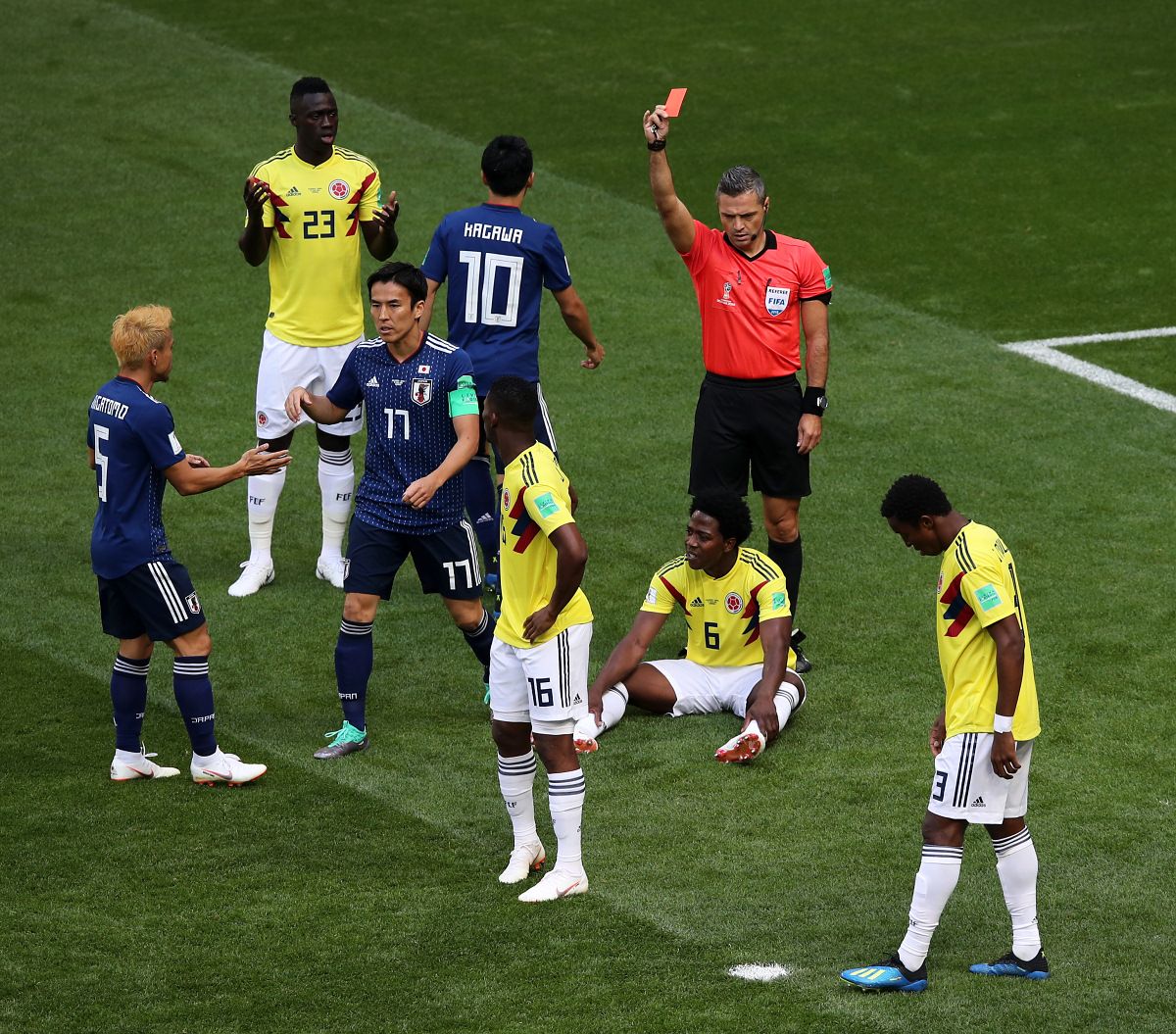 Для колумбийцев такое развитие событий стало шоком, вскоре они перестроили свою схему для игры вдесятером и перехватили инициативу в матче. Япония играла вторым номером, а Колумбия много атаковала и использовала высокий прессинг. Японцы откровенно доигрывали первый тайм, но оставить свои ворота на замке до перерыва не смогли. На 39-й минуте матча ударом со штрафного Хуан Кинтеро сравнял счёт. Колумбиец пробил низом под стенкой в левый от вратаря угол. Голкипер Японии Эйдзи Кавасима добрался до мяча уже после того, как тот пересёк линию ворот.