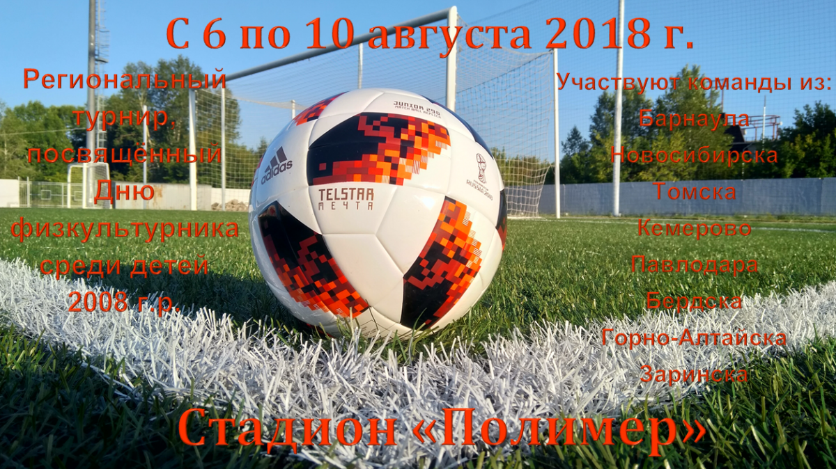 Сегодня на стадионе «Полимер» в Барнауле стартовал большой детский турнир, посвящённый Дню физкультурника. В соревнованиях участвуют 16 команд 2008 года рождения из Алтайского края, Новосибирской, Томской, Кемеровской областей, Республики Алтай и Республики Казахстан. Игры в четырёх группах пройдут 6−8 августа, а в следующие два дня - стыковые матчи.