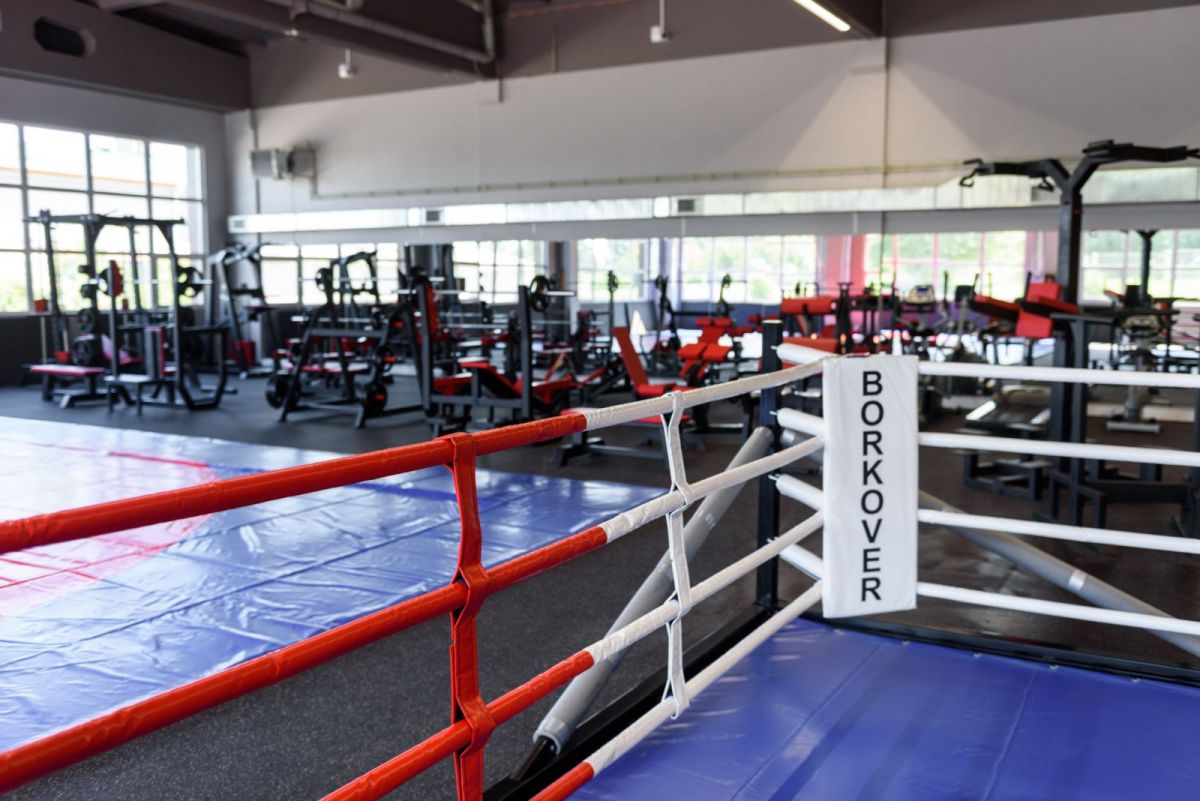 Для занятия боевыми искусствами здесь тоже есть всё необходимое - боксерские груши, подвесные и настенные мешки, большой борцовский ковёр с качественным покрытием и ринг.
