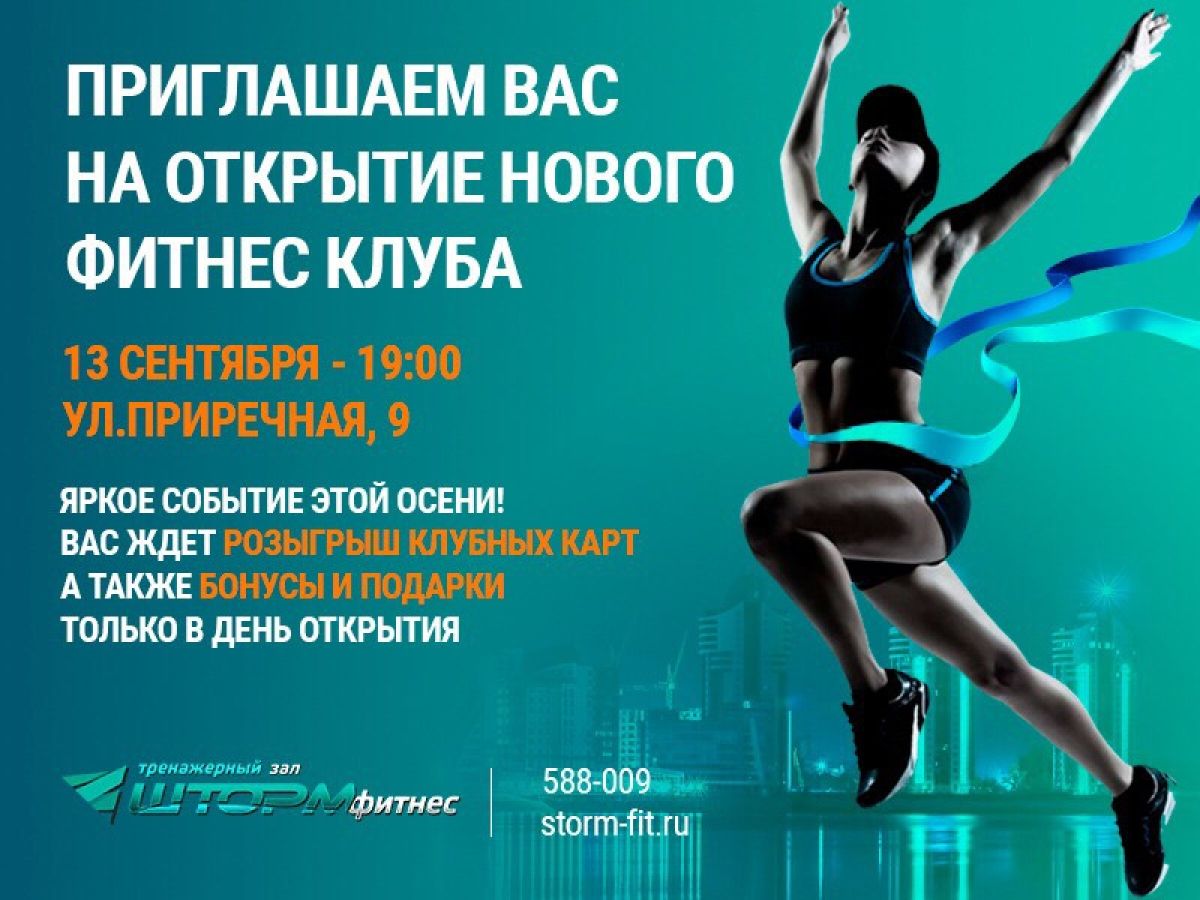 Как сообщает краевая федерация бодибилдинга, тренажёрный зал торжественно откроется по адресу: ул Приречная, 9. Начало мероприятия в 19:00. Подробная информация на сайте storm-fit.ru.