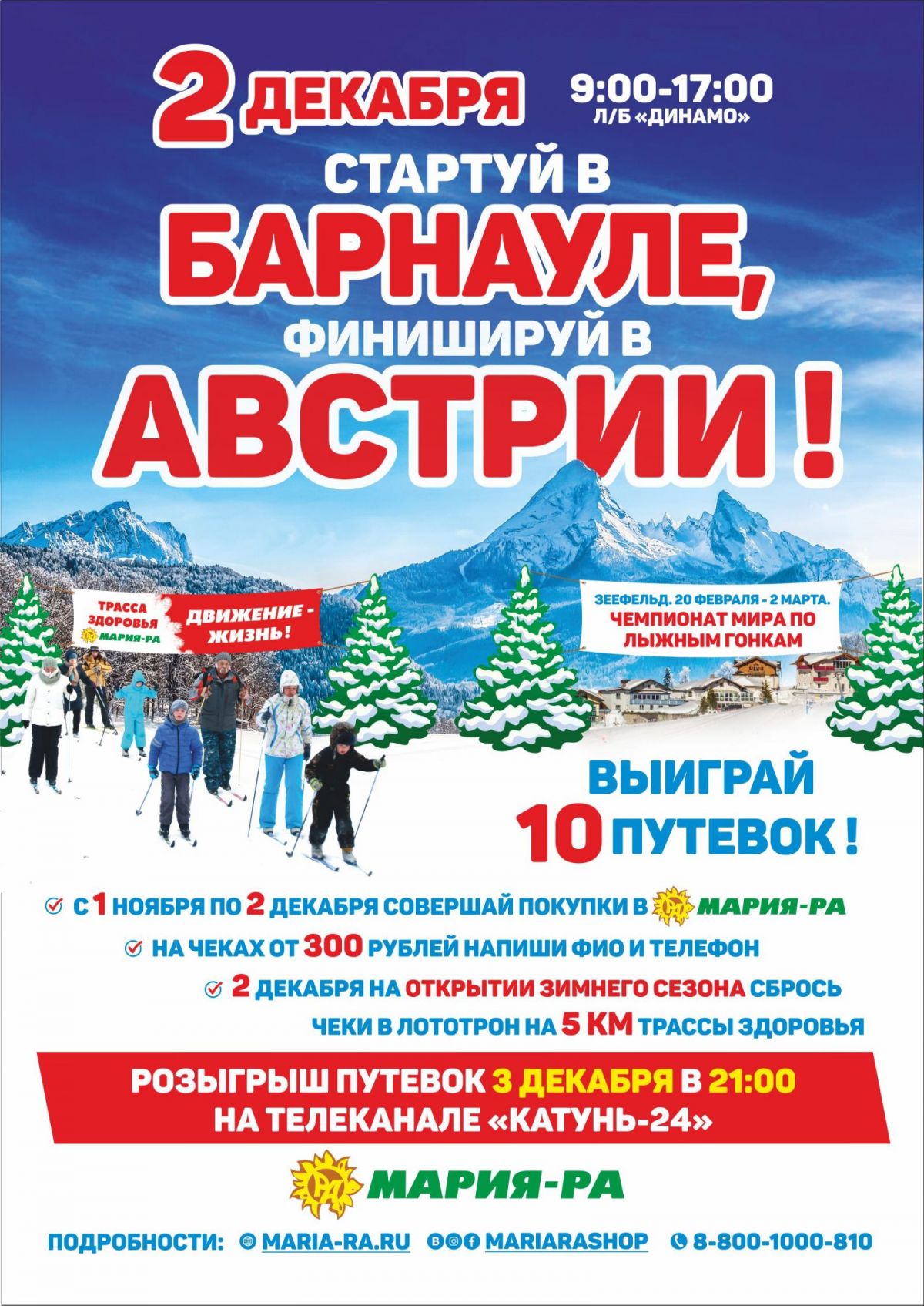 Чтобы стать участником этой акции, надо совершать покупки в любом магазине «Мария-Ра» по 2 декабря включительно на сумму от 300 рублей, затем написать на чеках свое ФИО и контактный телефон и сбросить их в лототрон на 5 км «Трассы здоровья». Розыгрыш путевок состоится 3 декабря в 21−00 на телеканале «Катунь-24». Информация с победителями акции будет опубликована на сайте MARIA-RA.RU