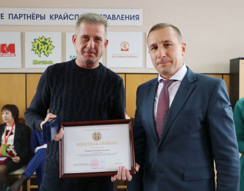 Почётной грамотой Правительства Алтайского края за многолетний добросовестный труд и высокий профессионализм награждён Владимир Алексеевич Маляренко, производитель работ ООО «КонТРАСТ Алтай», строивший базу спортшколы имени Константина Костенко на гребном канале.