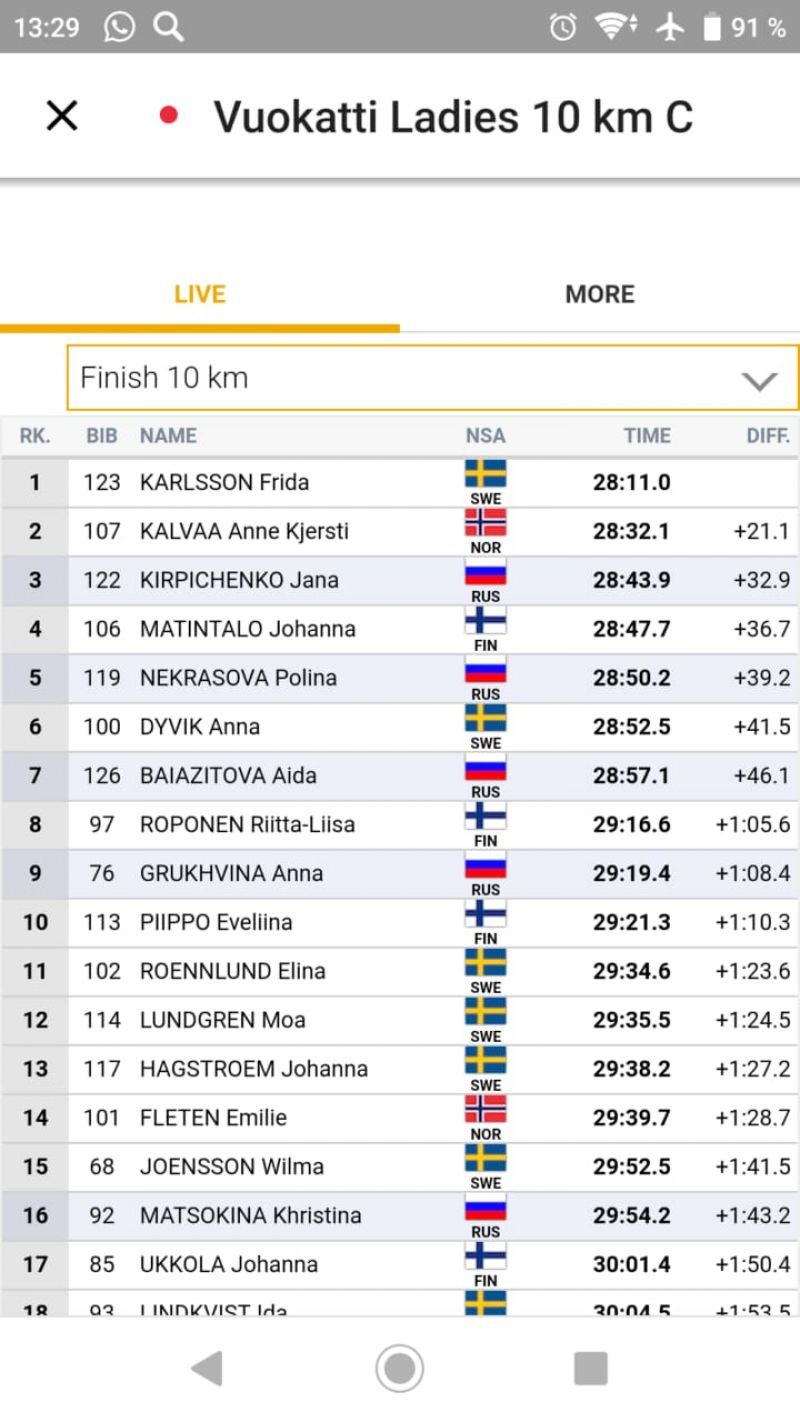Январские соревнования Кубка Скандинавии под эгидой FIS проходят в финском городе Вуокатти. 5 января лыжники соревновались в дистанционных гонках классическим стилем. В женской гонке на 10 км первенствовала шведка Фрида Карлссон. Её время - 28 минут 11, 00 секунды, с отставанием 21,1 секунды финишировала норвежка Анна Къерсти Кальво, с отставанием 32,9 секунды - россиянка, наша землячка Яна Кирпиченко. В гонке участвовали почти 90 лыжниц, в основном из Скандинавии и России.