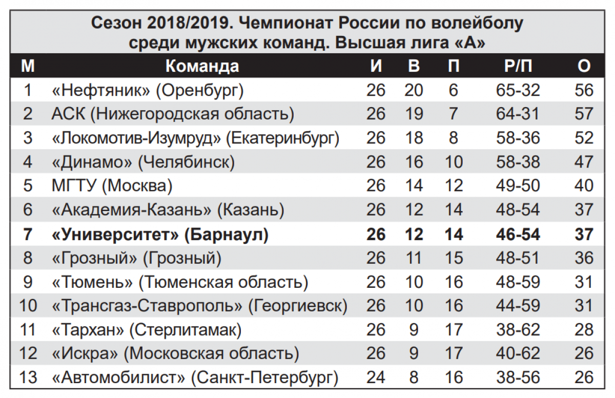 Волейболисты «Университета» сразу после новогодних каникул отправились в Оренбург, где их экзаменовал один из фаворитов высшей лиги «А» - «Нефтяник». К сожалению, начать год на позитивной ноте не удалось - барнаульцы дважды уступили с одинаковым счетом 0:3 (19:25, 11:25 и 19:25 и 17:25, 23:25, 22:25). Как видим, в одной из шести партий разрыв по волейбольным меркам просто неприличный. Безусловно, на качестве игры «студентов» сказалось отсутствие доигровщика Алексея Карпенко, который в нынешнем сезоне стал одним из основных винтов в механизме нашей команды. Как выяснилось, главный забойщик в конце декабря перенес операцию на мениске коленного сустава и вернется в строй в лучшем случае к играм с одинцовской «Искрой». Продолжает находиться в лазарете и опытный блокирующий Константин Порошин.