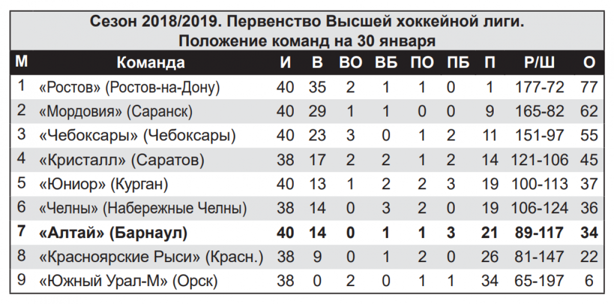 Первым из наших команд 2019 год открыл хоккейный «Алтай», сыгравший 8−9 января в Саратове против местного «Кристалла». И открыл весьма достойно, выиграв в первом матче (6:4) и уступив на следующий день в серии буллитов (1:2), зацепив при этом одно очко. В победной игре барнаульцы сразу «прибили» хозяев, забросив к восьмой минуте три безответные шайбы, и дальше уже играли по счету. Надо отдать должное саратовцам, которые в попытке спасти встречу за пять с половиной минут до сирены сократили отставание (5:4), но «Алтай» выстоял, а в концовке нанес нокаутирующий удар. Стоит отметить, что дубль в этой игре оформил капитан Владислав Янцен.