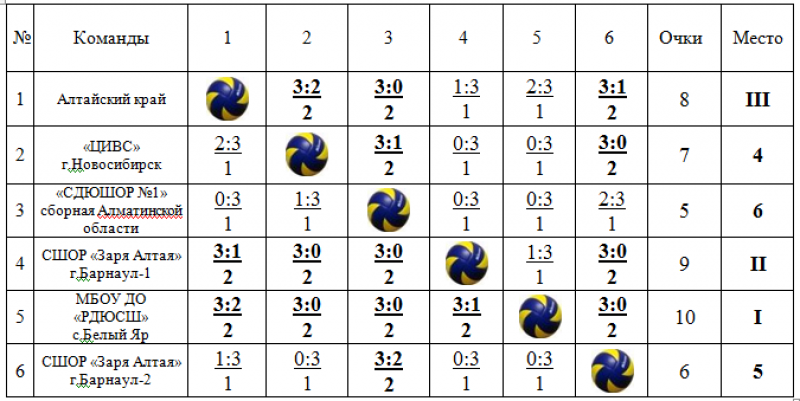 Победитель определился в матчах по круговой системе. Им стала команда республиканской ДЮСШ из Хакасии (село Белый Яр), которая победила во всех пяти матчах. На втором месте первая команда краевой спортшколы по волейболу «Заря Алтая», на третьем - сборная Алтайского края.