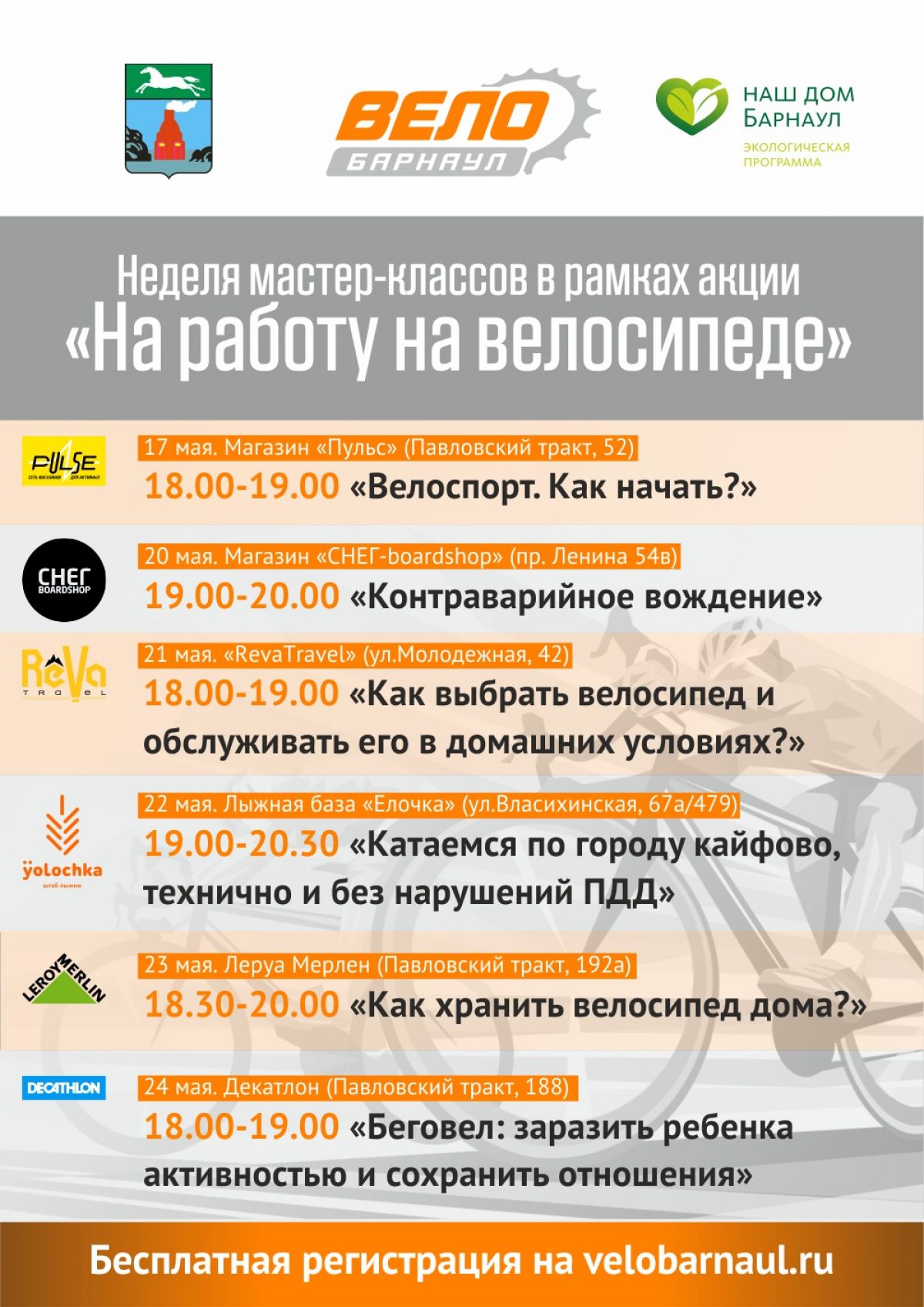 Обращаем ваше внимание, что на каждый мастер-класс нужна регистрация, так как есть ограничение по количеству людей в группах. Подробности на сайте VeloBarnaul.ru и в группе ВК «ВелоБарнаул - велосипедная жизнь Алтая».