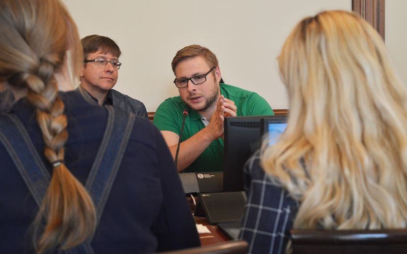 15 июня в зале ученого совета АлтГУ на Димитрова известные спортивные журналисты встретились со студентами. Мероприятие проходило в рамках проекта «MELAMEDIA», организованного бывшим учащимся Алтайского государственного университета, а ныне - комментатором спортивного федерального канал «Матч-ТВ"- Михаилом Меламедом. Вместе с Михаилом в Барнаул из столицы прилетели Денис Казанский, Роман Трушечкин, Сергей Кривохарченко, Артём Шмельков, Михаил Моссаковский, Роман Скворцов, Денис Левко (все - журналисты «Матч-ТВ») и пресс-атташе московского ХК «Спартак» Владимир Самохин.