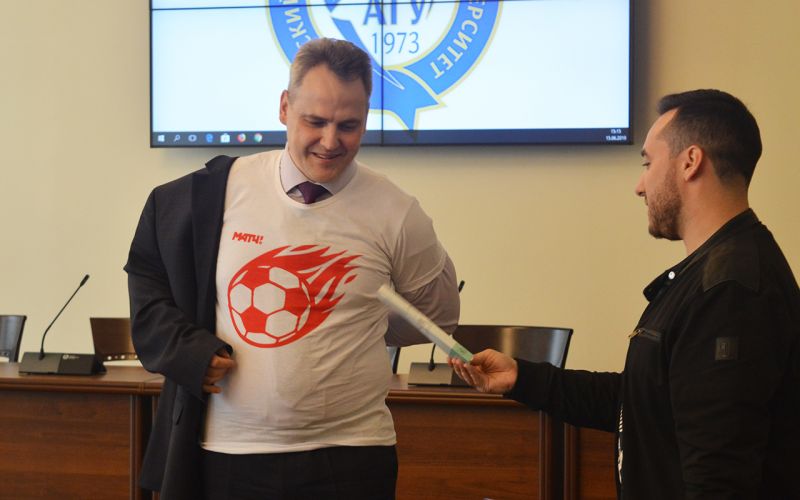 После чего ректору вручили фирменную футболку «Матч-ТВ», а приезжим журналистам в ответ - памятные подарки.