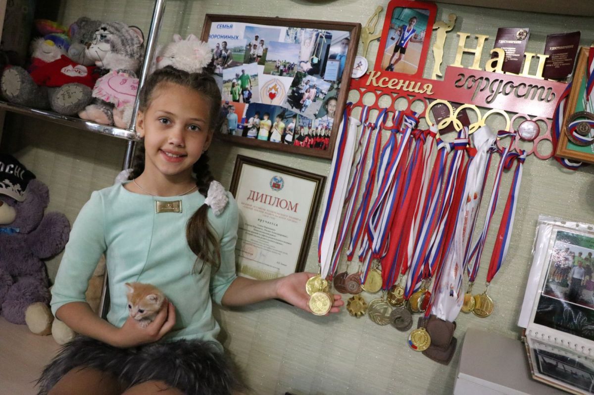Ксюша Воронина в спорте буквально с пеленок. С таким папой у нее, пожалуй, другого выбора не было. Она занимается легкой атлетикой, волейболом, ходит на танцы. В ее комнате на стене висит медальница, на которой едва умещаются завоеванные награды. Ксюша говорит, что самая ценная из них - привезенная из Сочи.