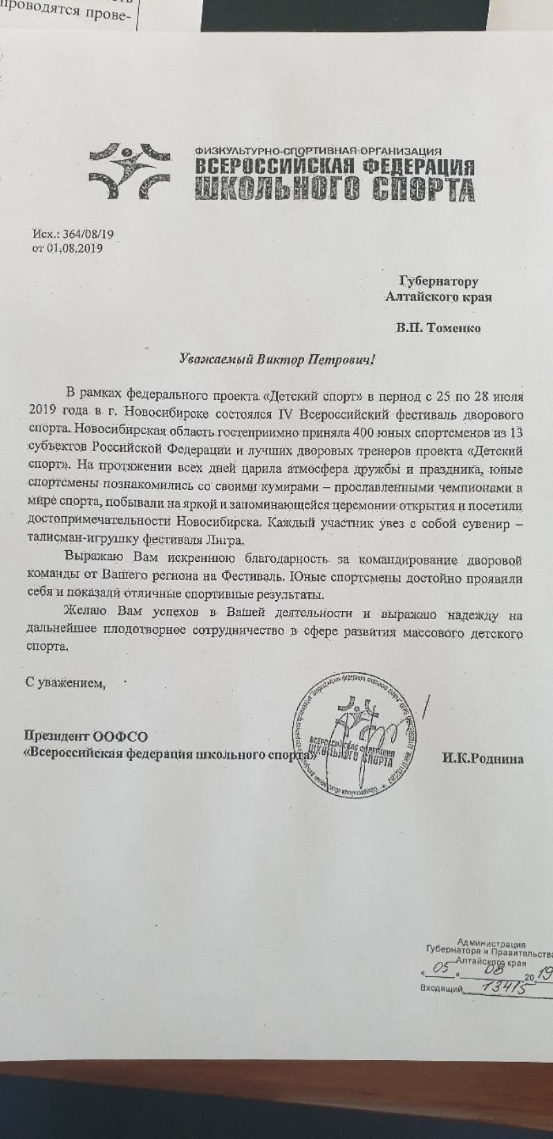 - Пришло письмо на имя губернатора Виктора Томенко от Ирины Родниной с благодарностью за участие команды Алтайского края и поддержку массового спорта. Велика вероятность, что мы сможем доказать руководителям федерального проекта «Детский спорт» наши возможности и в 2020 году примем и проведём VII Всероссийский фестиваль дворового спорта у нас в Алтайском крае!