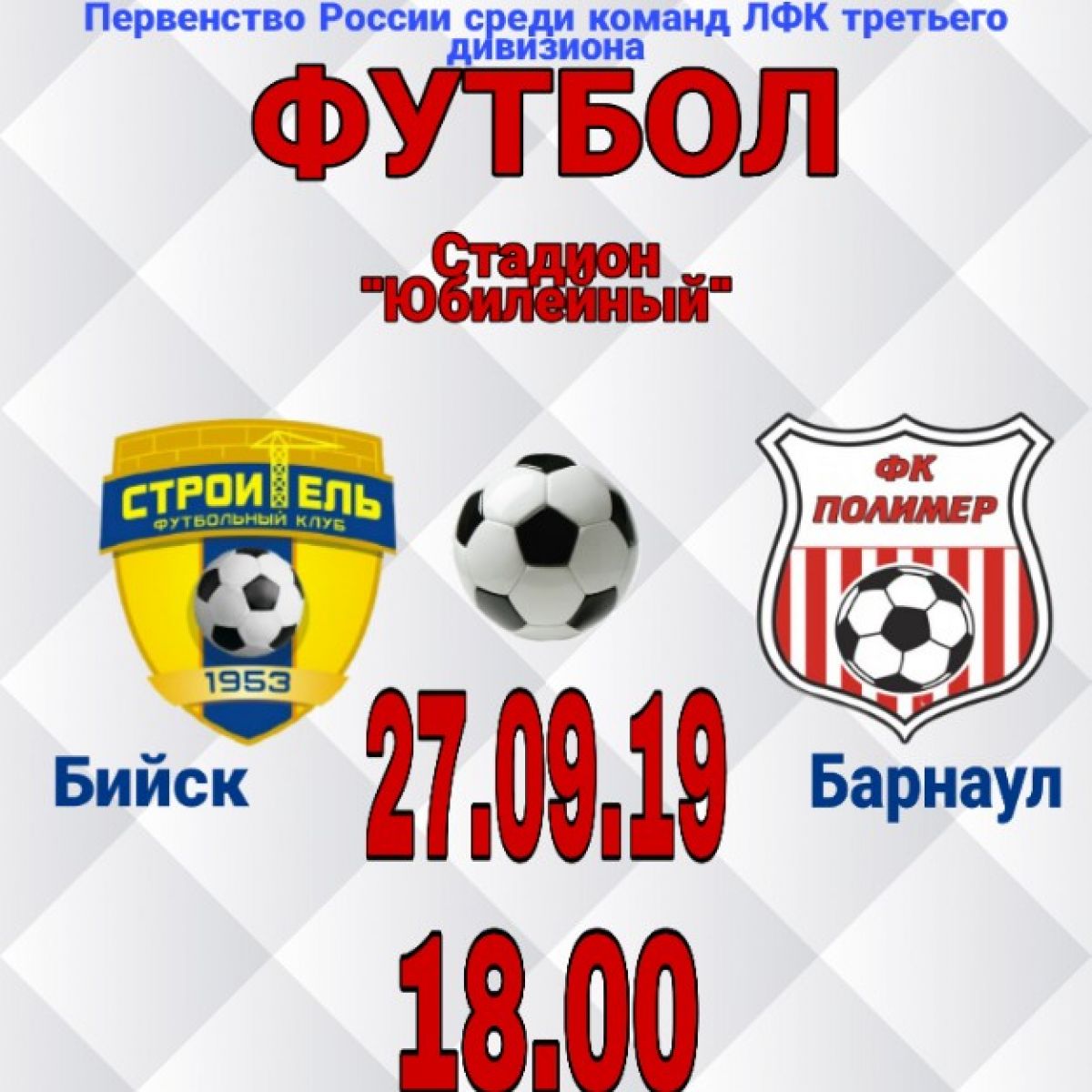 27 сентября в Бийске на стадионе «Юбилейный» состоится принципиальный матч: местный «Строитель» примет на своем поле барнаульский «Полимер» в рамках очередного тура первенства России по футболу среди любительских команд в третьем дивизионе Высшей лиги зоны «Сибирь».
