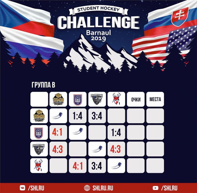 Второй игровой день турнира Student Hockey Challenge-2019 в Барнауле открылся противостоянием США и Чехии, а также матчем российских команд из Челябинска и Нижнего Новгорода. Вот их результаты: