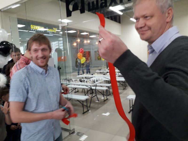 За час до мероприятия юные академики в сопровождении взрослых стали собираться в фойе третьего этажа, рядом с шахматным залом нашей академии. Конечно, им не терпелось сесть за доску и начать партию. Но сначала нужно было зарегистрировать всех участников соревнований, а их оказалось больше 80, а затем провести открытие турнира. Символическую красную ленточку перерезали почетные гости праздника - вице-президент федерации шахмат Алтайского края, председатель Тренерского совета Максим Герасимюк и представители компании-партнера «Красный Кит» - директор Николай Богданов и его заместитель Евгений Азаров. На торжественной линейке состоялась церемония приема в ученики академии, новичкам повязали фирменные синие галстуки с логотипом нашей организации.