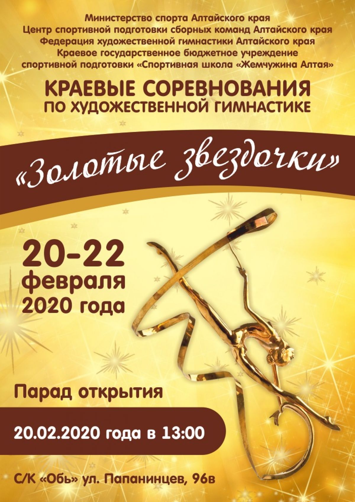 Краевые соревнования по художественной гимнастике «Золотые звездочки» пройдут с 20 по 22 февраля в Барнауле в спорткомплексе «Обь» (ул. Папанинцев, 96-в).