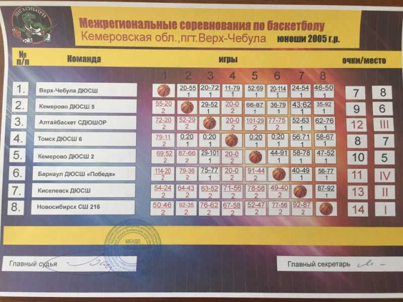 В посёлке городского типа Кемеровской области Верх-Чебула 12−15 марта прошли заключительные игры группового этапа Детской баскетбольной лиги Сибири среди юношей 2005 года рождения. Алтайский край представляли команды краевой СШОР «АлтайБаскет» (тренер Андрей Александрович Гусев) и барнаульской СШ «Победа» (тренер Валентина Ивановна Постникова).