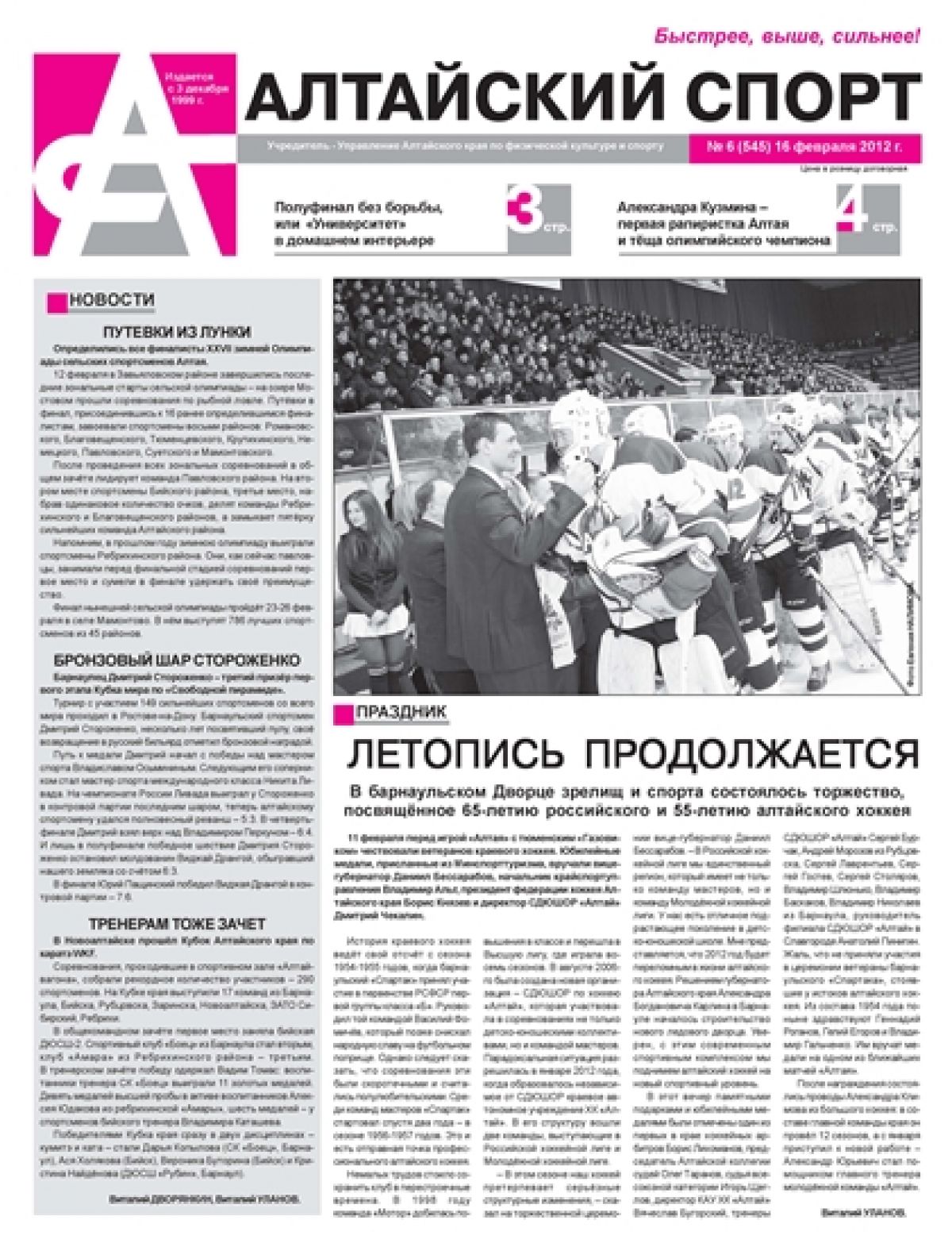 • Летопись продолжается. В барнаульском Дворце зрелищ и спорта состоялось торжество, посвящённое 65-летию российского и 55-летию алтайского хоккея.