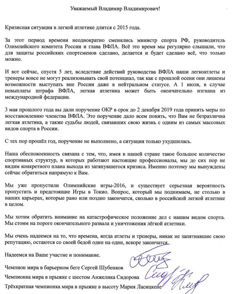 Российские легкоатлеты Мария Ласицкене, Анжелика Сидорова и Сергей Шубенков обратились с открытым письмом к президенту России Владимиру Путину в связи с ситуацией в российской лёгкой атлетике. Письмо одновременно появилось в «инстаграмах» спортсменов.