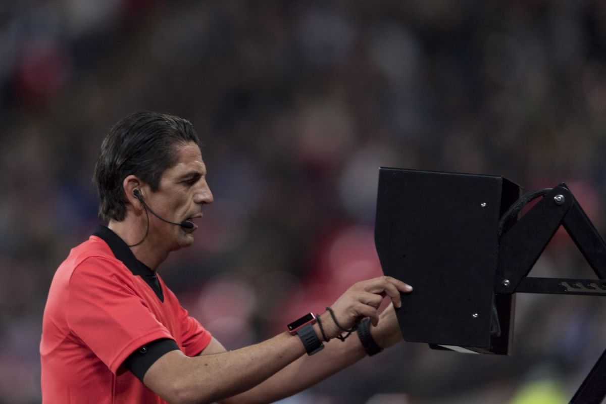 1. Арбитру следовало отдельно указать характерным жестом (знак очертаний телевизора), что VAR оценивает эпизод. Этот абзац убран. Теперь арбитр слушает помощника и затем один раз показывает, что решение принято по подсказке видеоассистента.