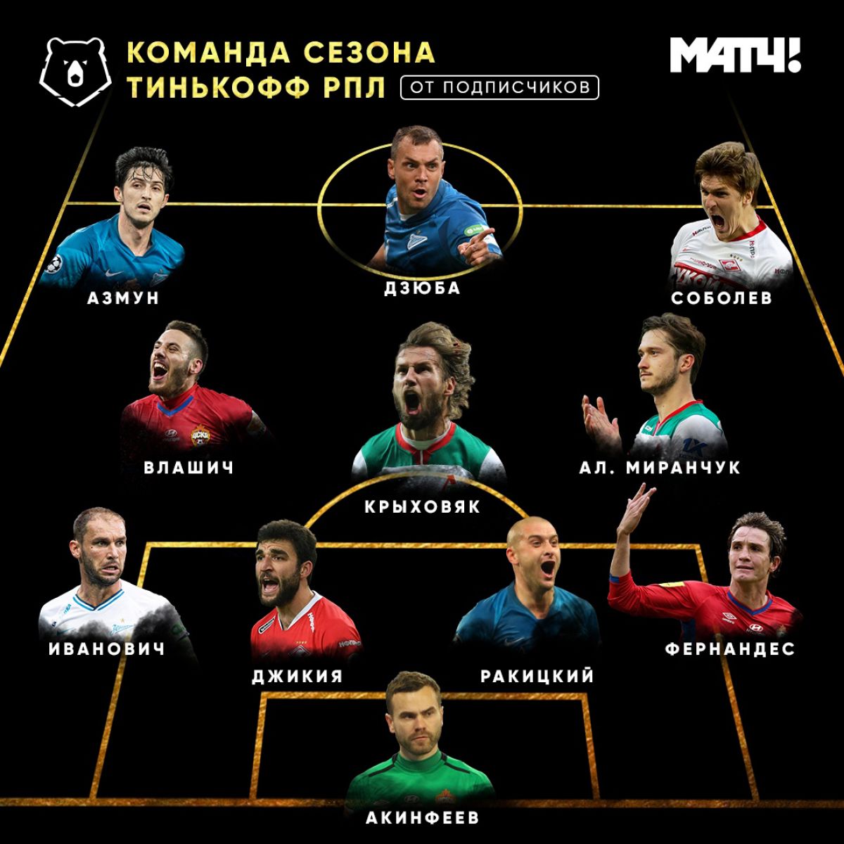 В нападении символической сборной оказались Артем Дзюба, Сердар Азмун и наш земляк, воспитанник барнаульского «Динамо» Александр Соболев, по ходу сезона сменивший «Крылья Советов» на «Спартак». В полузащите представлены Никола Влашич, Гжегож Крыховяк и Алексей Миранчук, в линии защиты — Бранислав Иванович, Георгий Джикия, Ярослав Ракицкий и Марио Фернандес, а ворота защищает Игорь Акинфеев.